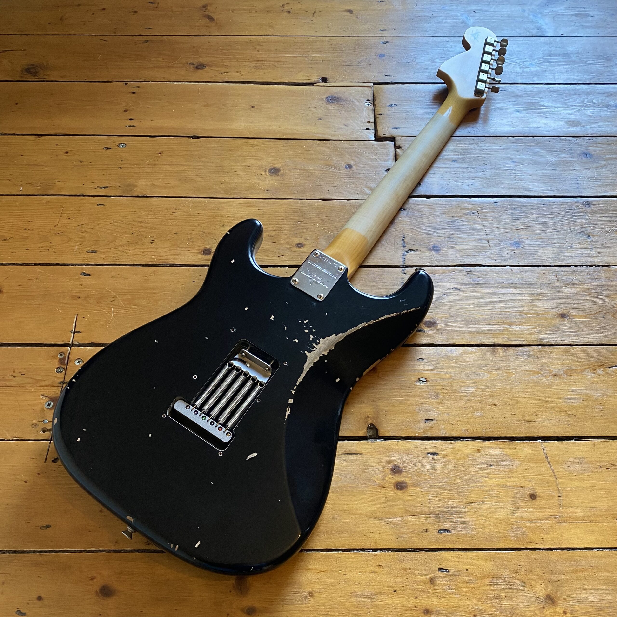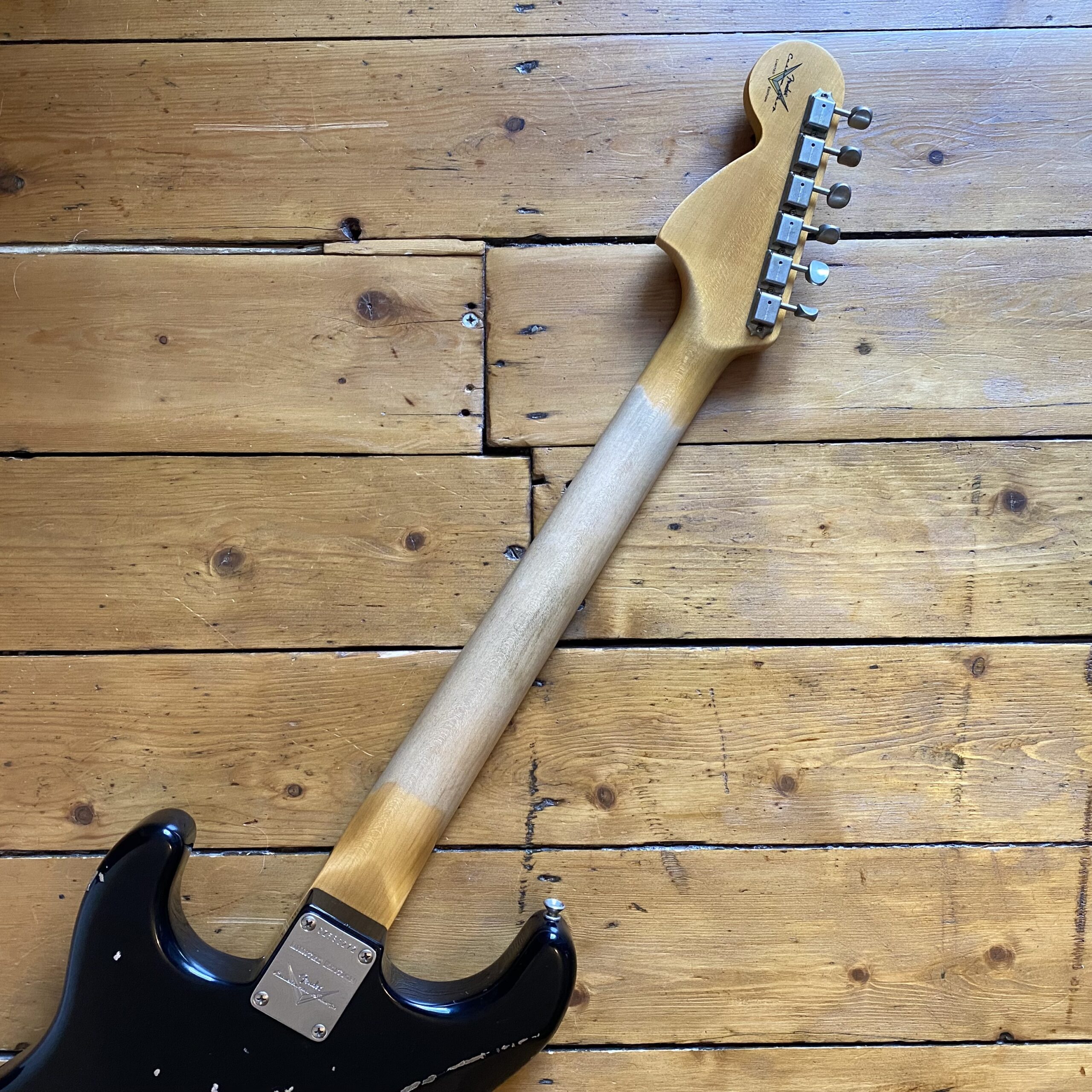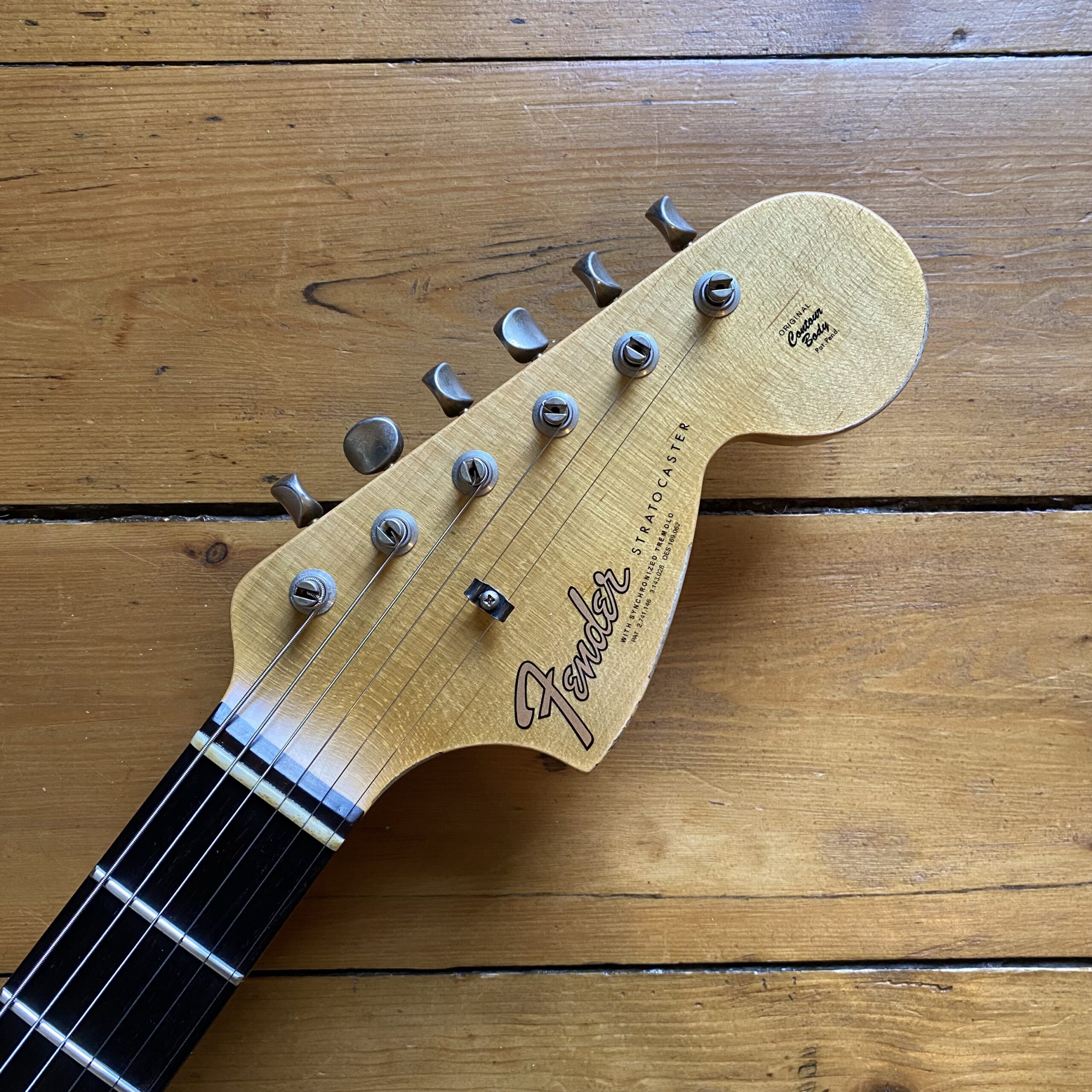 With period-correct appointments and a worn, played-in nitrocellulose finish the guitar is super comfortable. It features an alder body with thinly applied nitrocellulose lacquer with heavy ageing. The neck is quartersawn maple with a super dark tight grain AAA rosewood fingerboard and the super comfortable ’65 Stratocaster “C” profile, ensuring ultimate stability with fantastic feel. The fingerboard is inlaid with real mother of pearl and more unusually for Fender is a 12″ (Gibson) radius meaning huge bends are possible and is much more “Gibson” in feel combined with sought after mid 60’s Strat neck profile. The heavy relic treatment continues throughout the guitar with period correct hardwear adding to the player-ready looks and that true comfort of a “broken in” finish.
