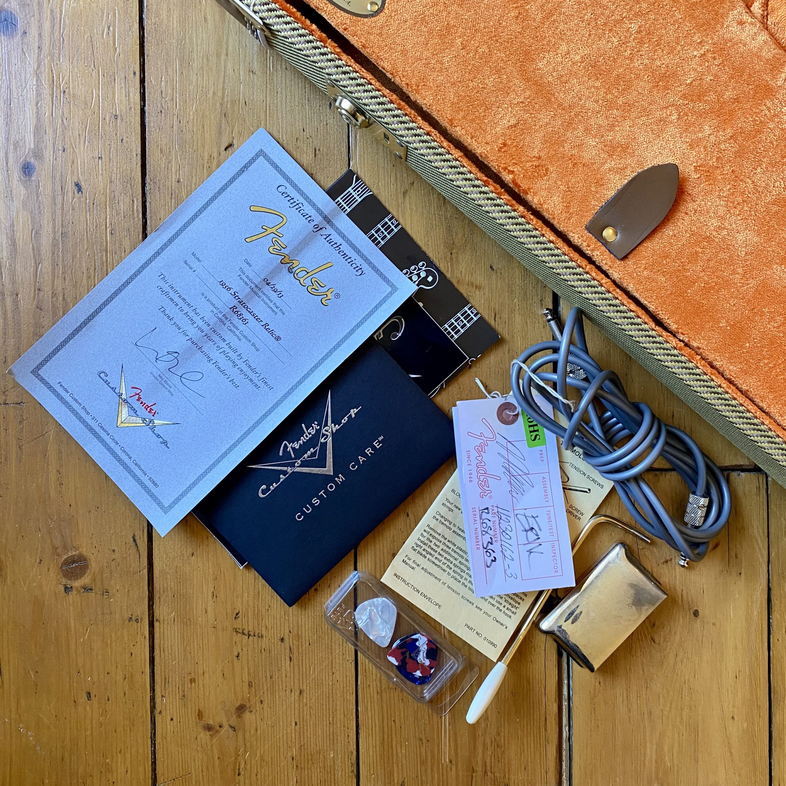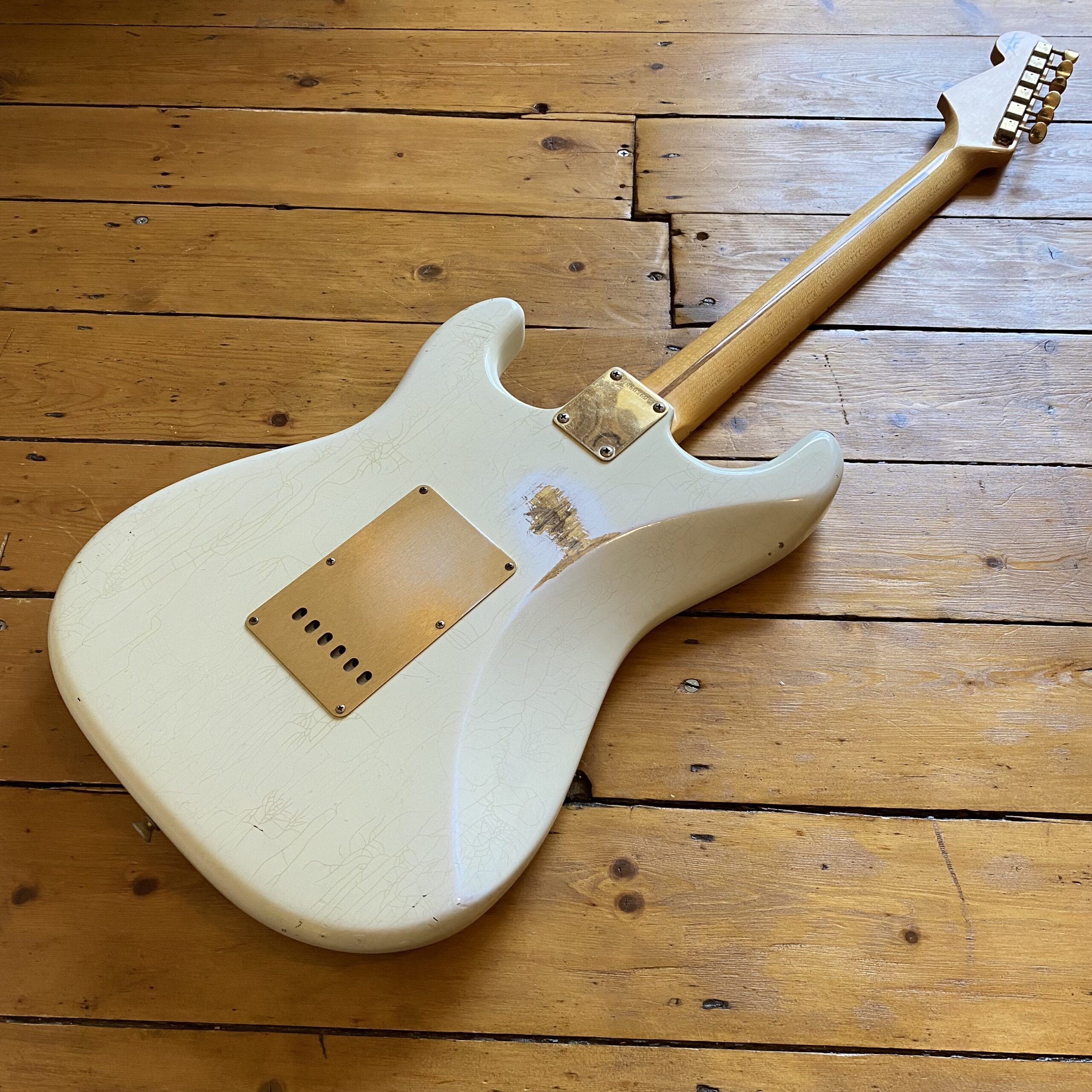 The ageing attention to detail on this one is fantastic. A really nice vibe to it and is without a doubt one of the nicer playing and sounding Strats we’ve had in. The woods selected for this creation are definitely a step above the regular custom shop stuff and it really does “ring like a bell”. The two piece Ash body is finished in a truly authentic aged vintage white nitrocellulose finish with plenty of natural wear and checking. It feels and plays beautifully, not to mention its exquisite looks with the aged gold hardware!