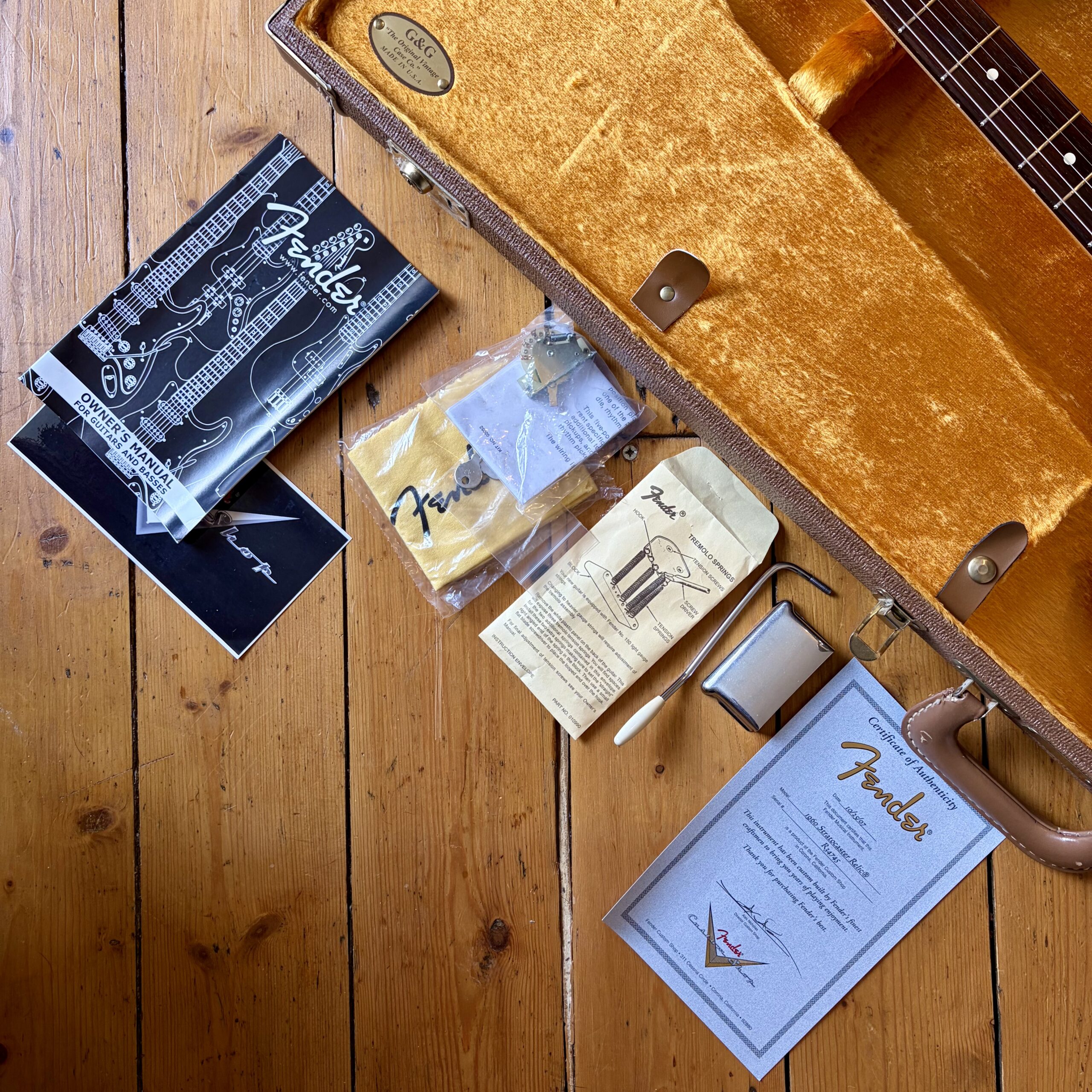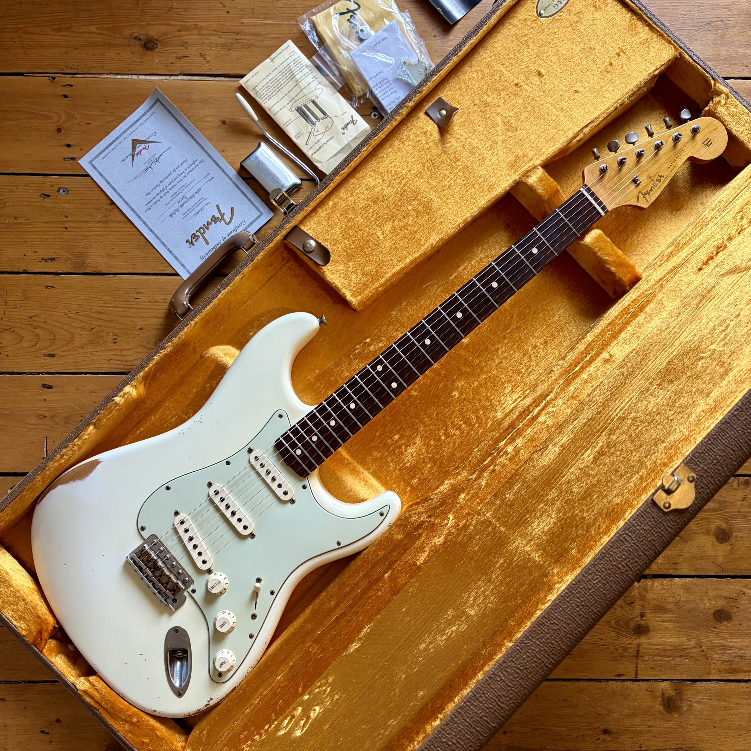 The sale includes the case and all candy in the images including the springs, polishing cloth, ashtray and the supplied fender 5 way switch should you desire to change it to more modern switching. Everything is present including the certificate of authenticity.