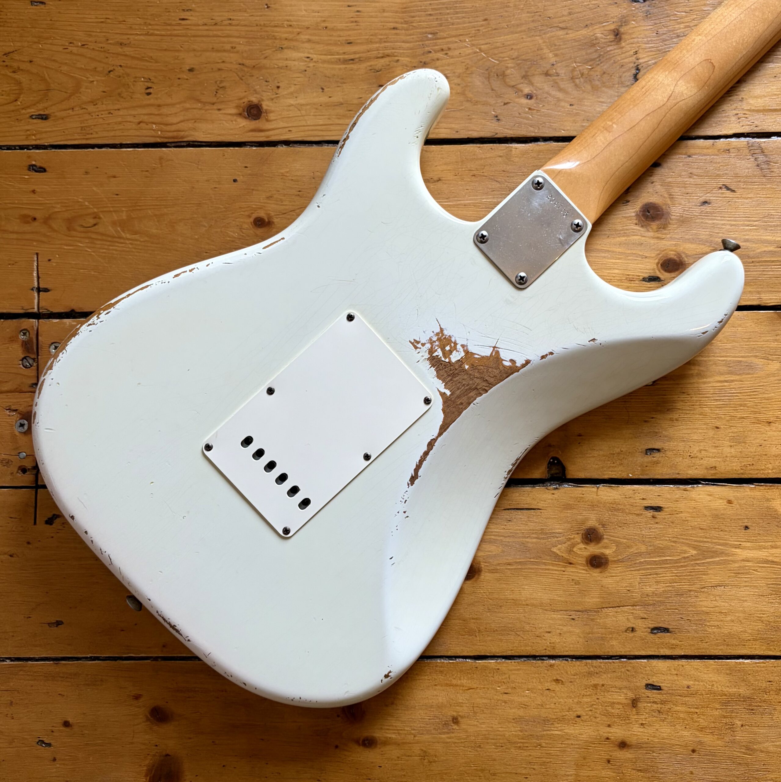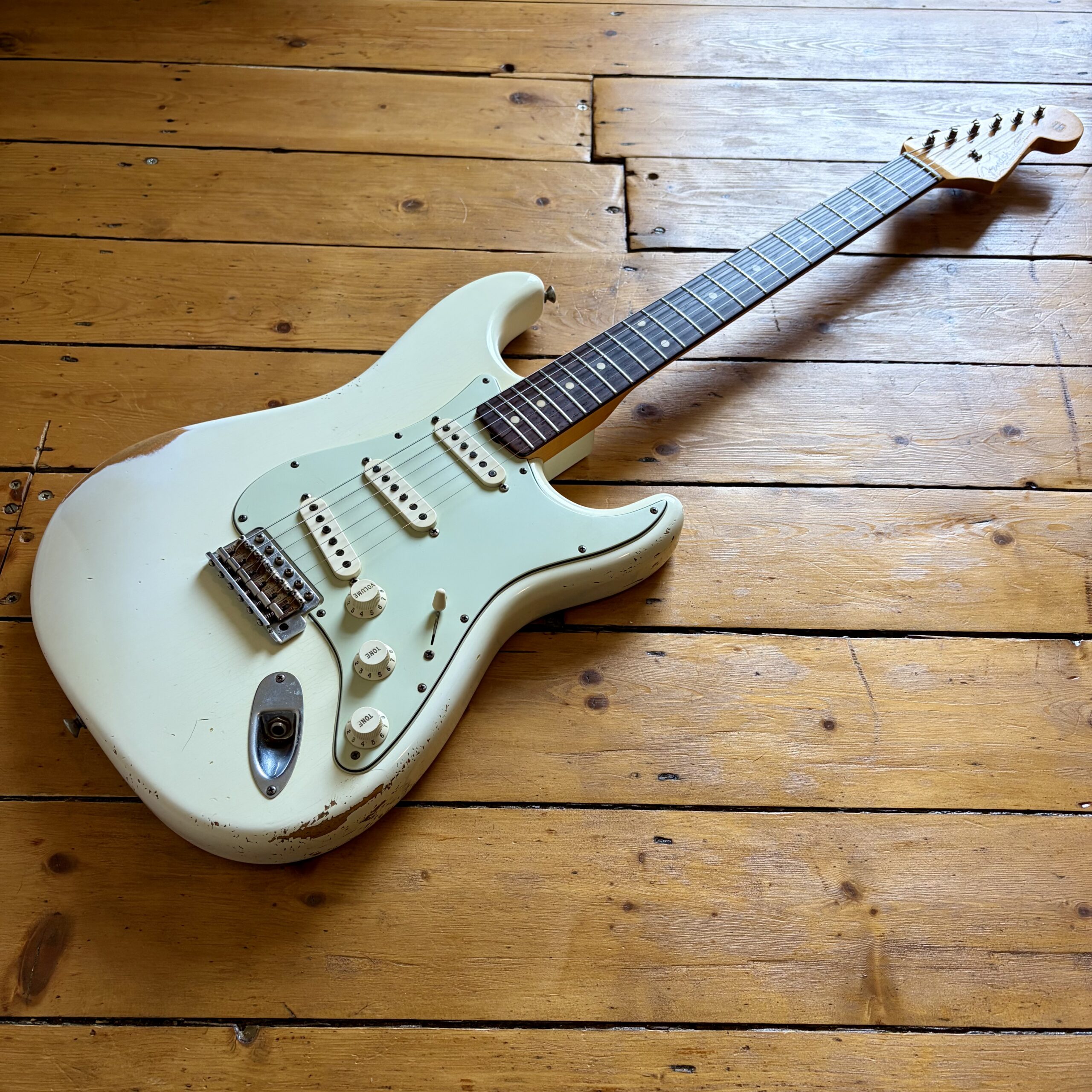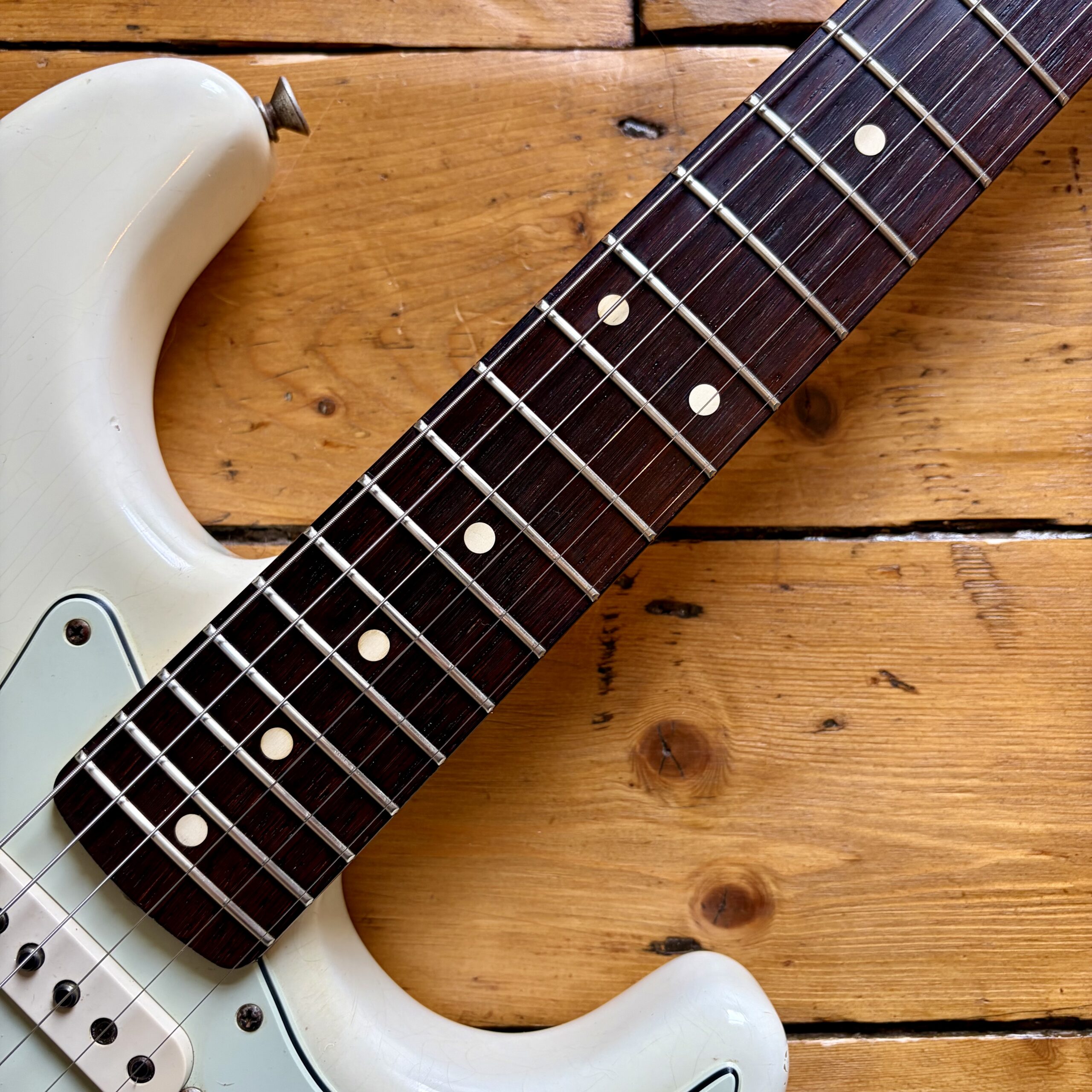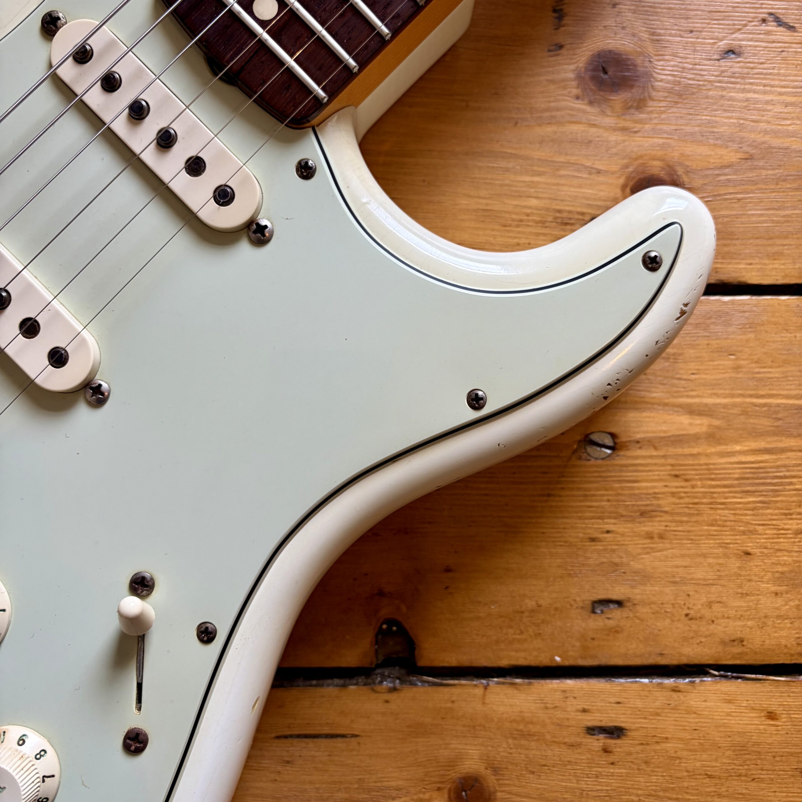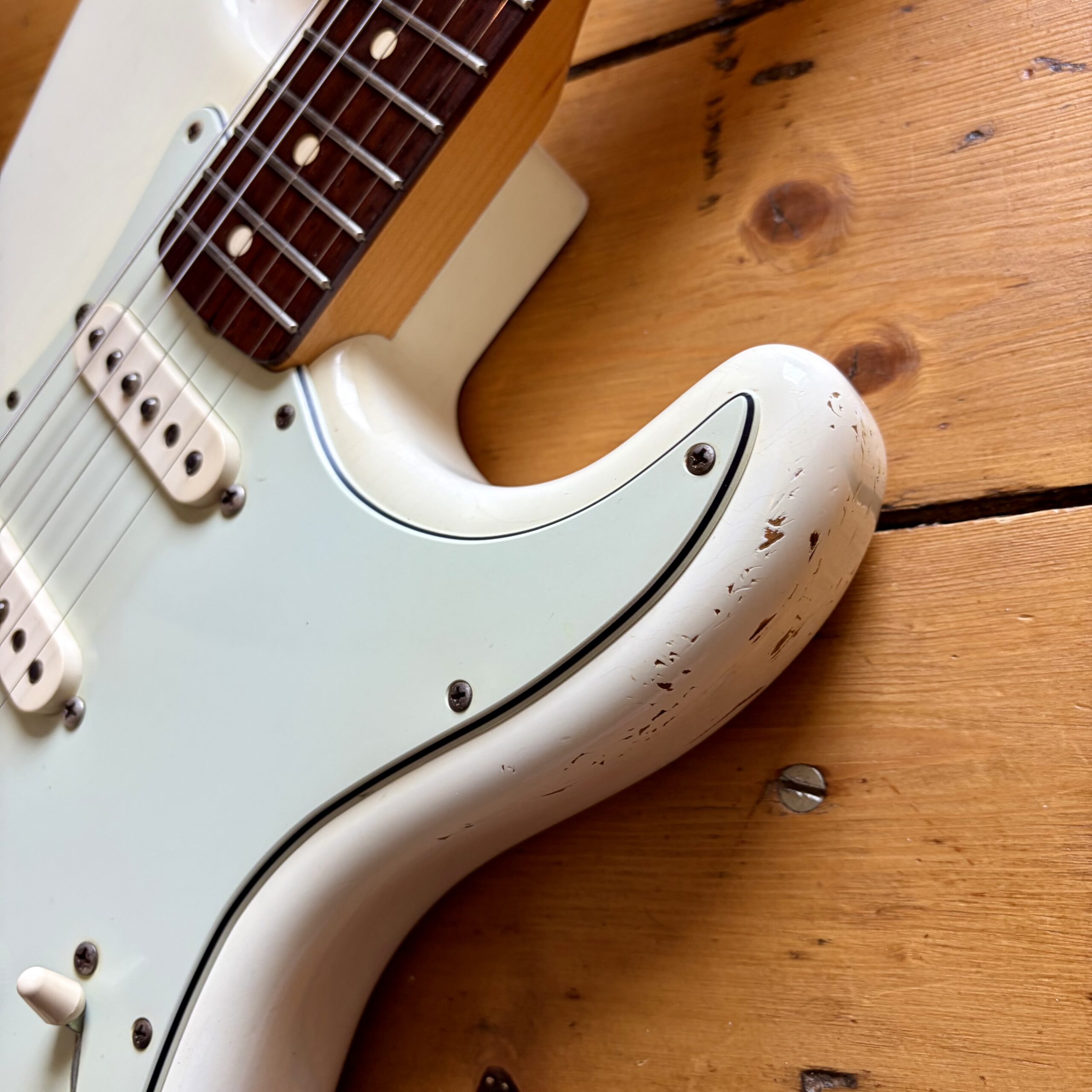 A thin tastefully reliced Olympic White nitrocellulose finish is ageing nicely and keeps the guitar lightweight, resonant and looking the part with all the usual relic features throughout the guitar.
