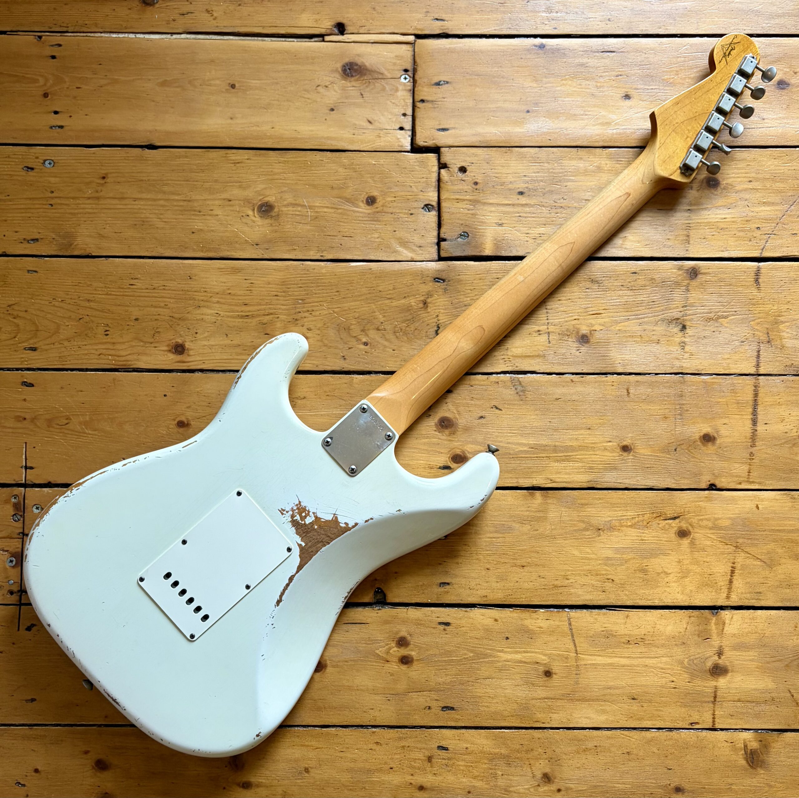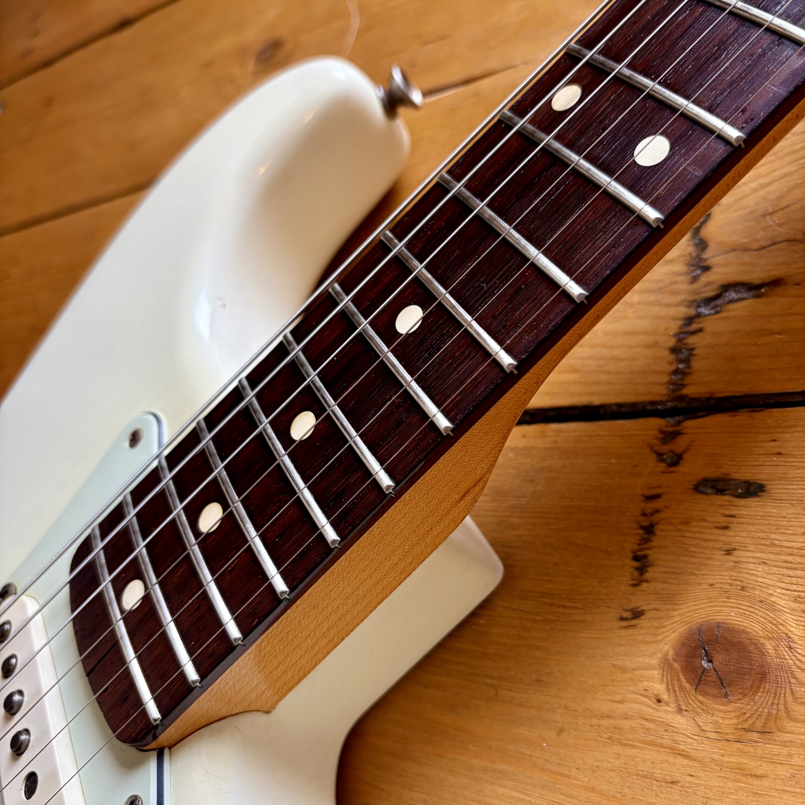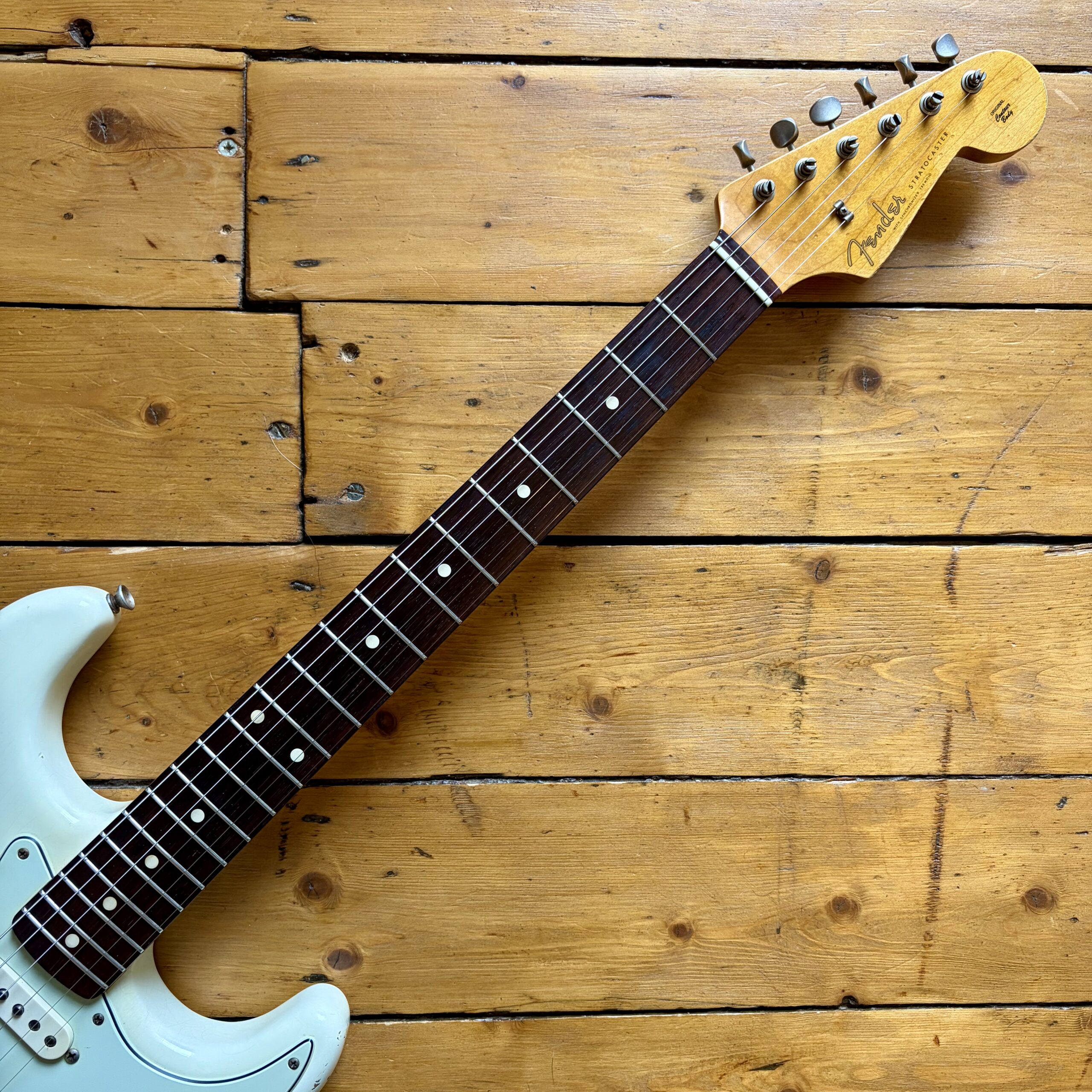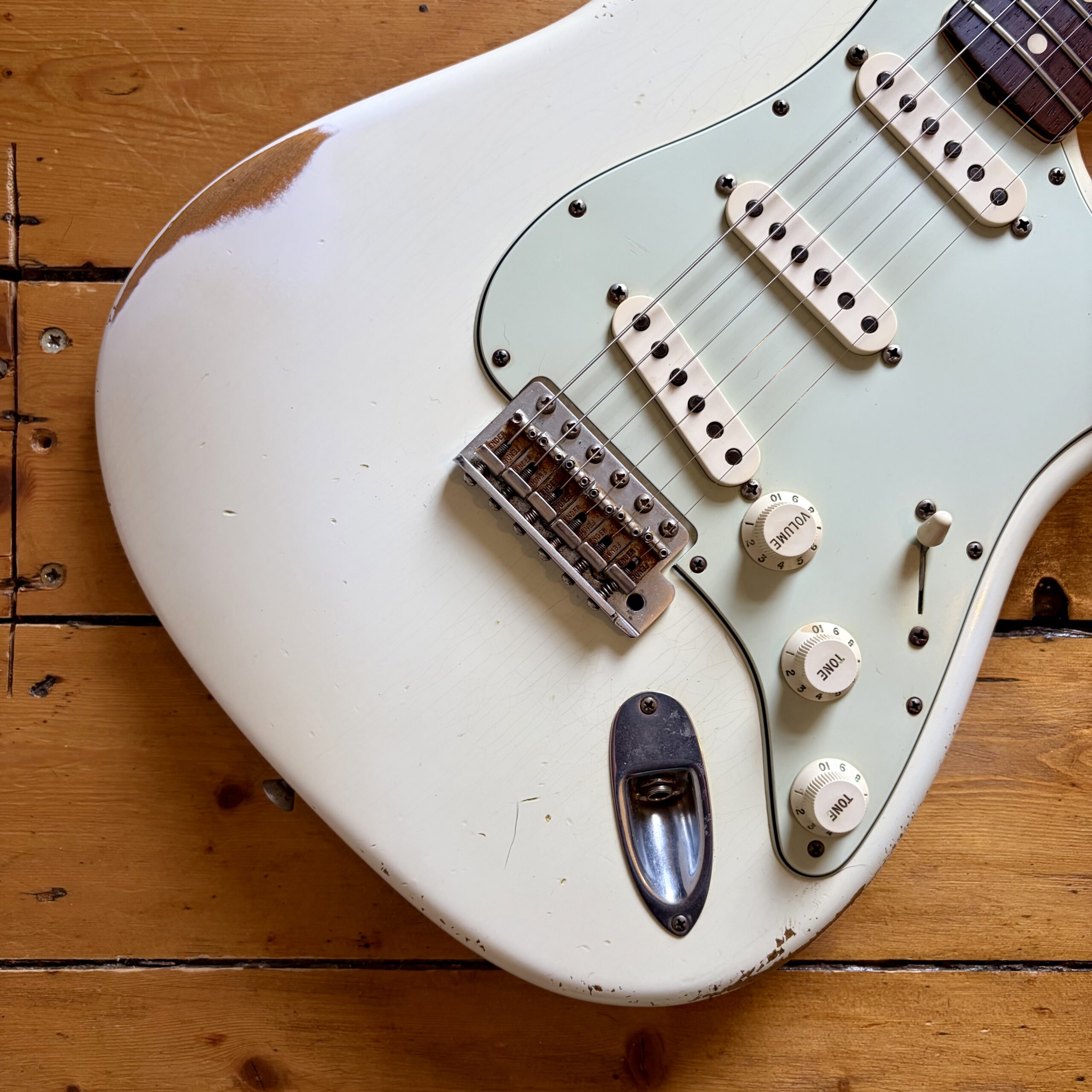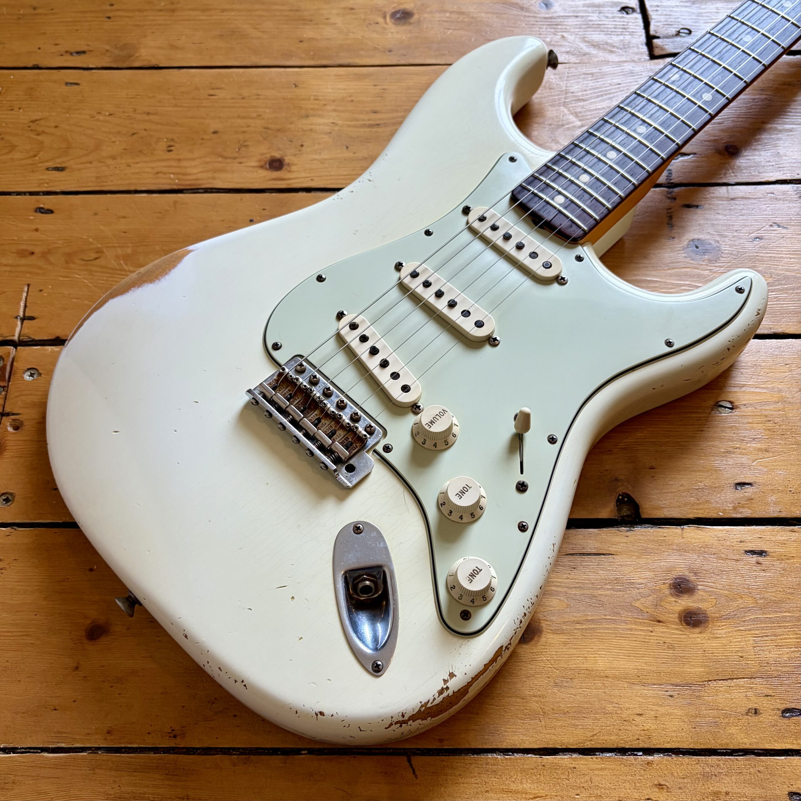 A thin tastefully reliced Olympic White nitrocellulose finish is ageing nicely and keeps the guitar lightweight, resonant and looking the part with all the usual relic features throughout the guitar.