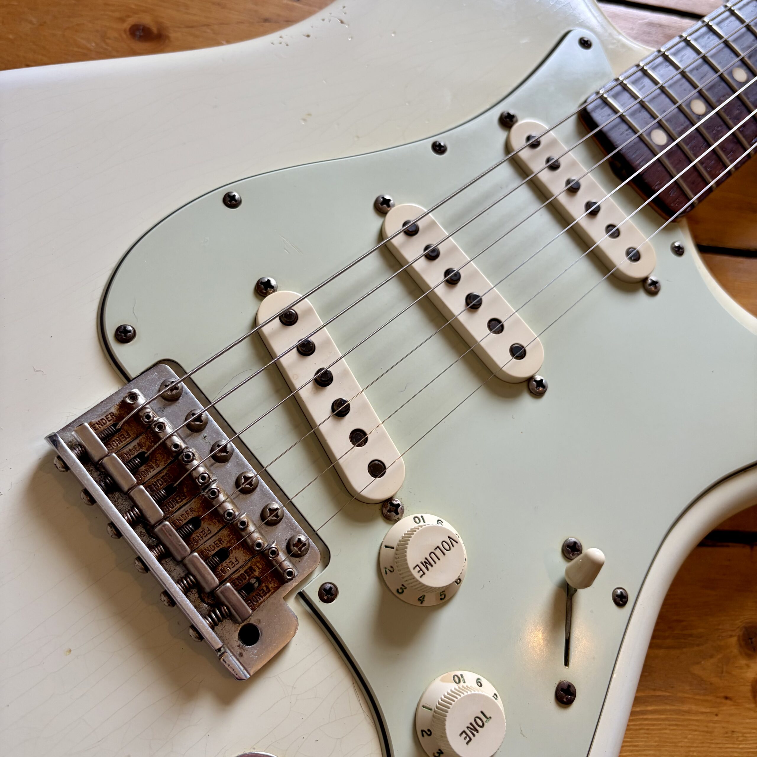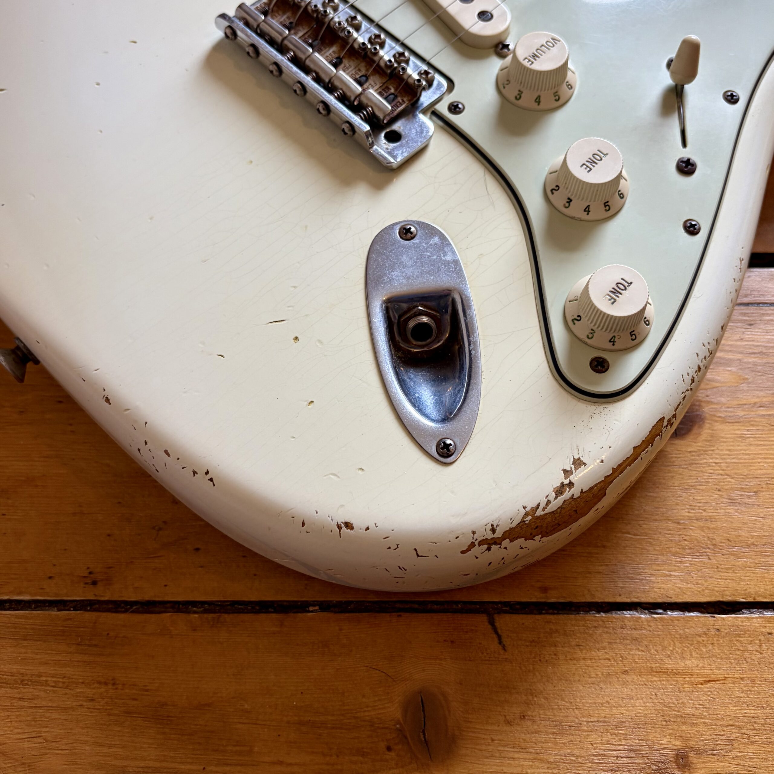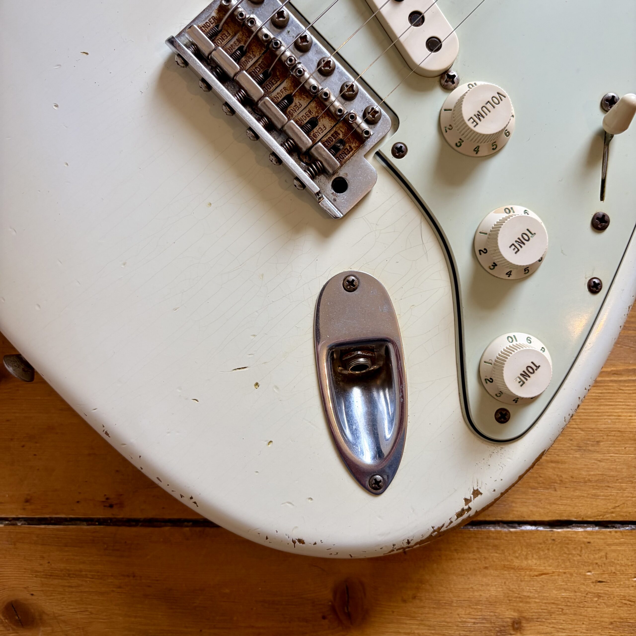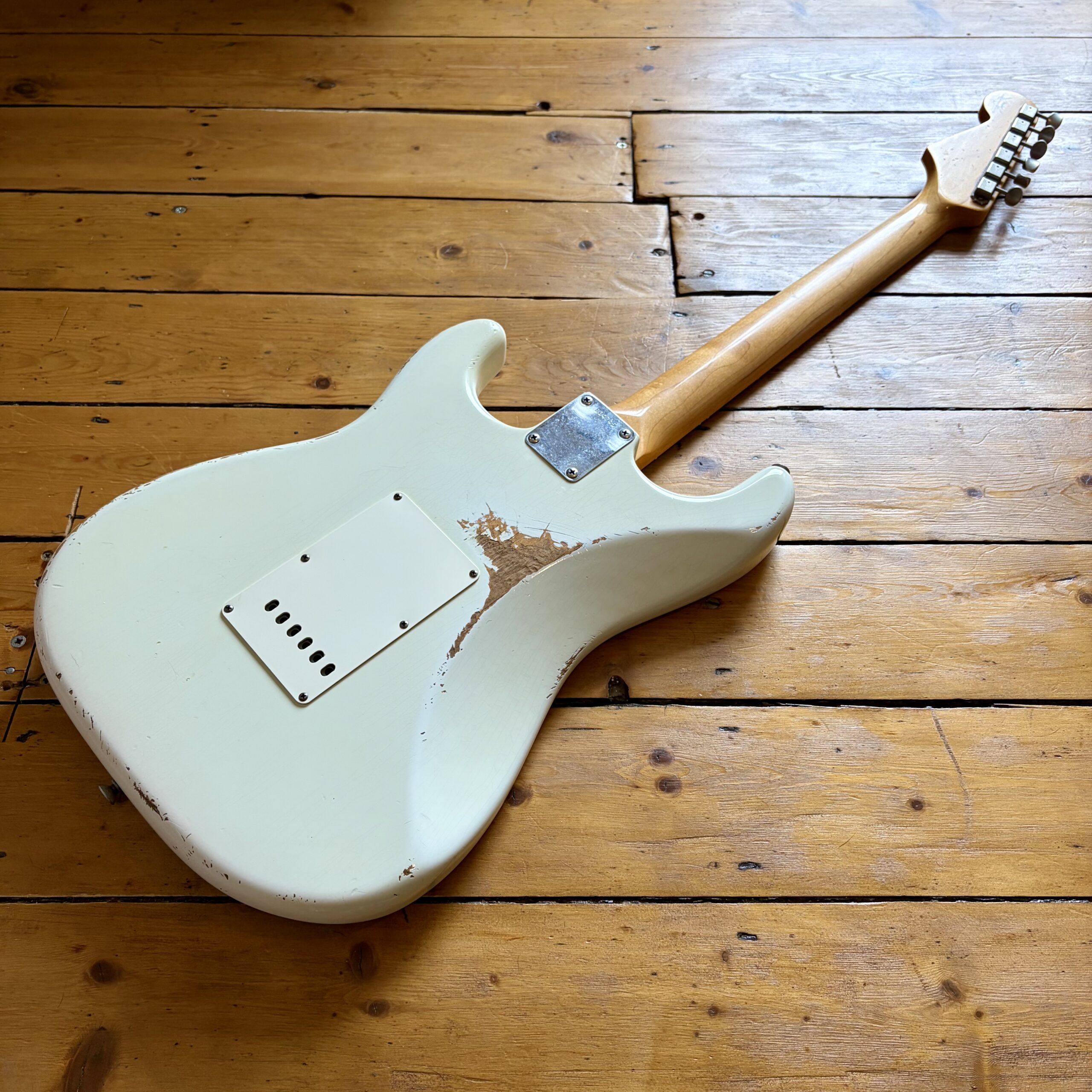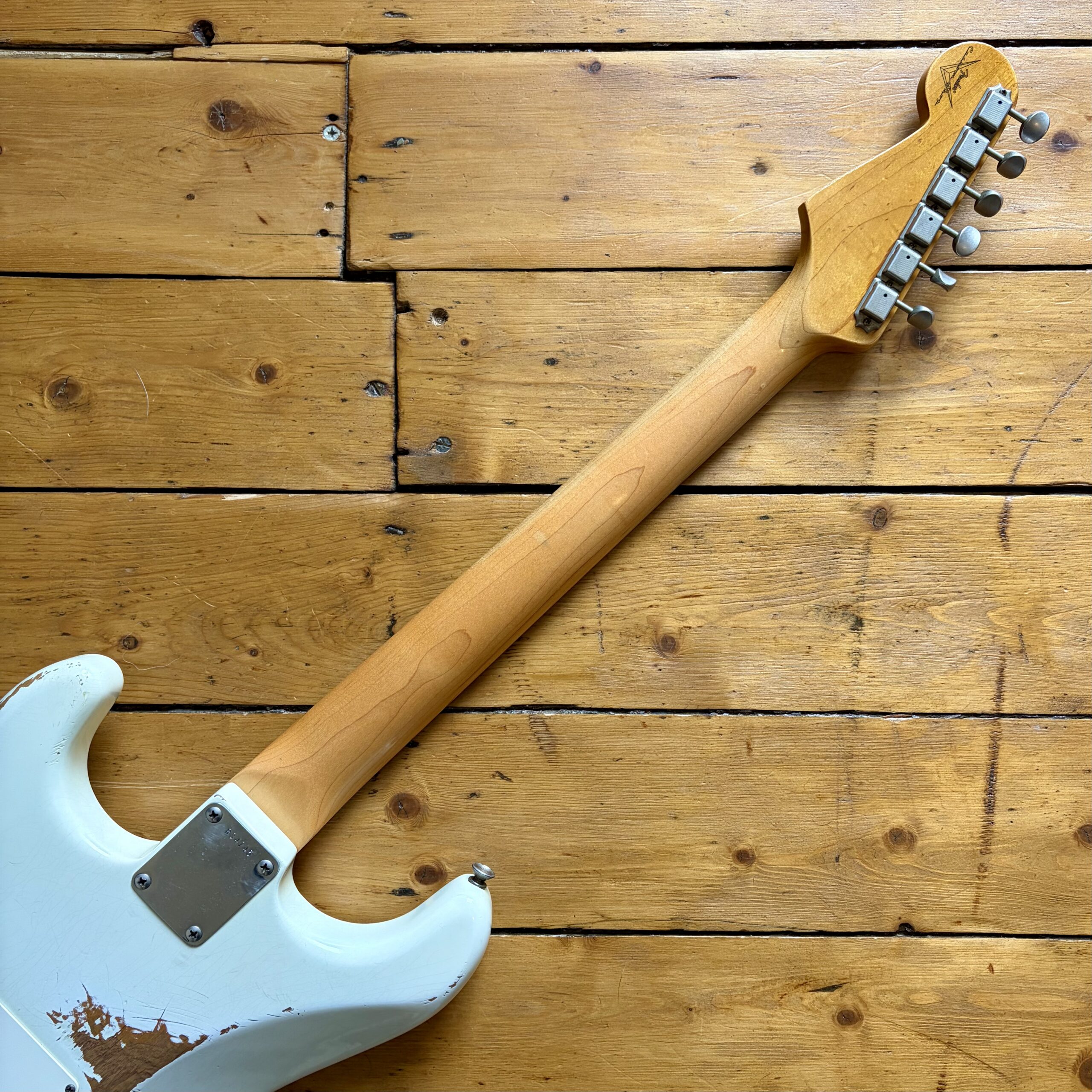A thin tastefully reliced Olympic White nitrocellulose finish is ageing nicely and keeps the guitar lightweight, resonant and looking the part with all the usual relic features throughout the guitar.