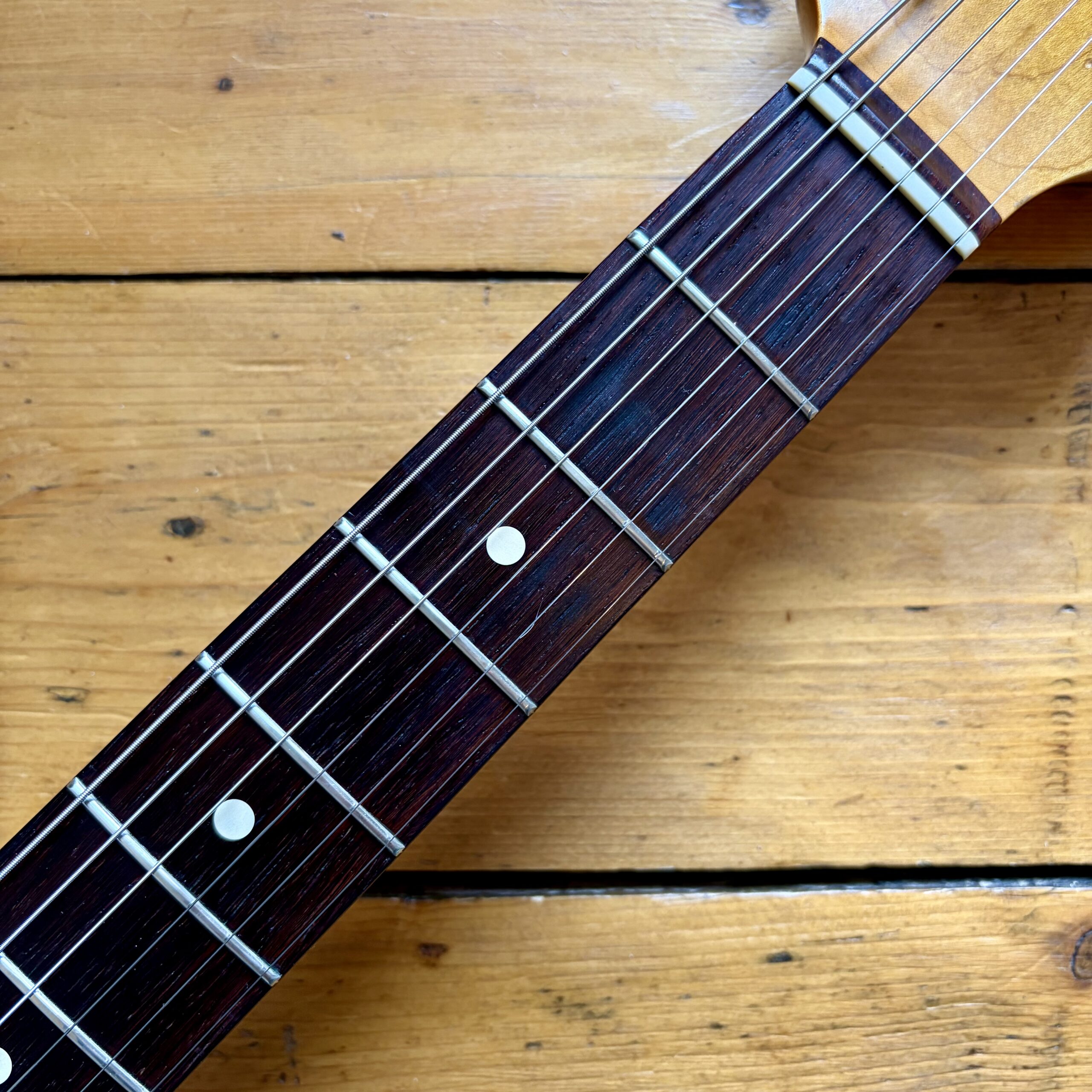 The guitar is nice and light at 7.65lb, its resonant Alder body and stunning 60 C shape quartersawn maple neck with dark tight grain slab rosewood fretboard have a lovely feel, with the neck finish just starting to wear a little from play (see images). Our favourite neck profile to leave the of the custom shop!