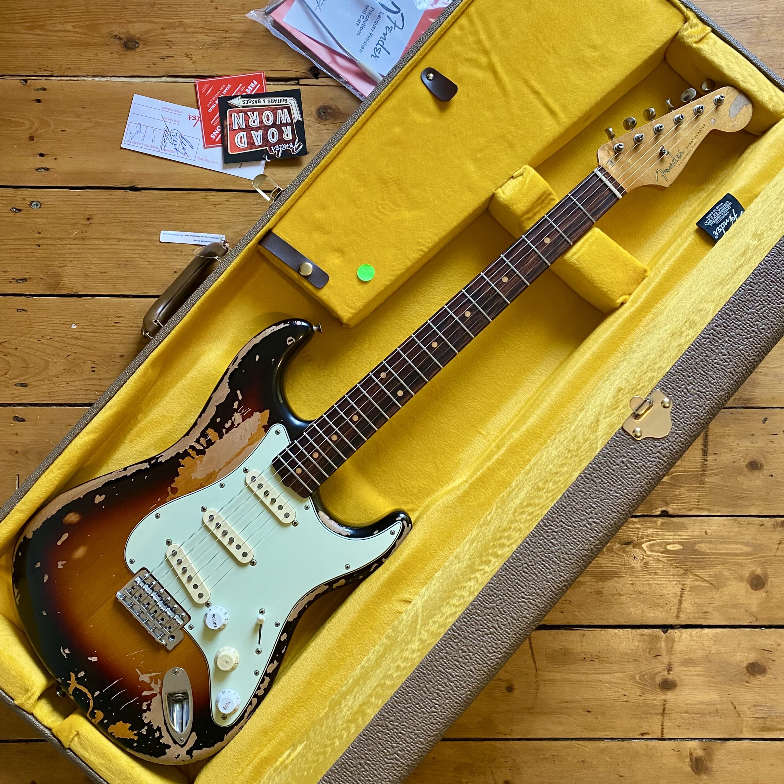 The Alder body is loaded with signature custom wound Mike McReady 60’s vintage-voiced single coils and the Fender treble bleed circuit, it has that unmistakable Strat chime on the top end, a warm, expressive midrange, and just the right amount of grit when you dig in. Whether you’re chasing smoky blues licks, grunge anthems, or hard rock this guitar responds and takes it all in its stride. This guitar represents incredible value for money in a very vintage feeling package and is pretty much as it left the factory with case candy, tremolo etc unopened.