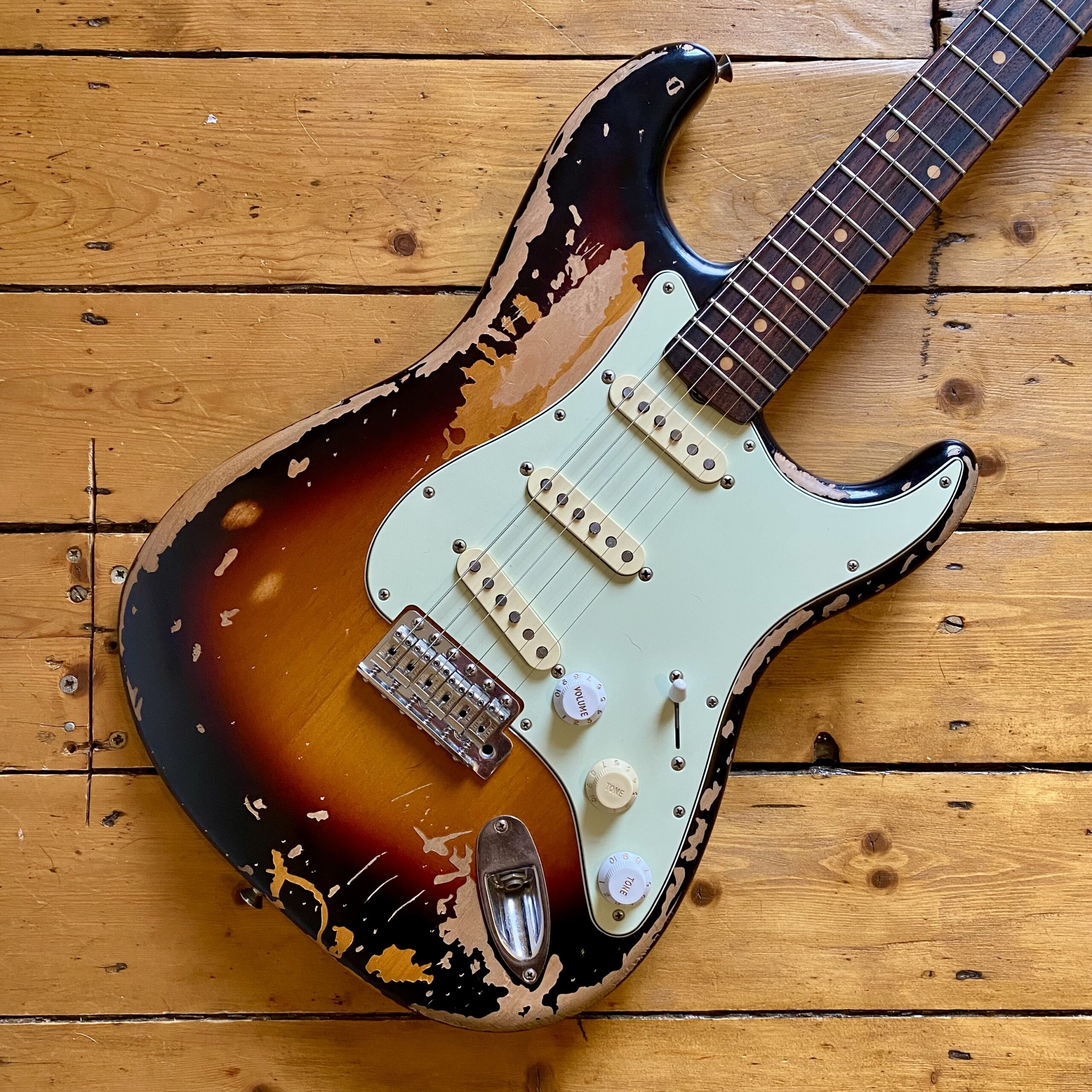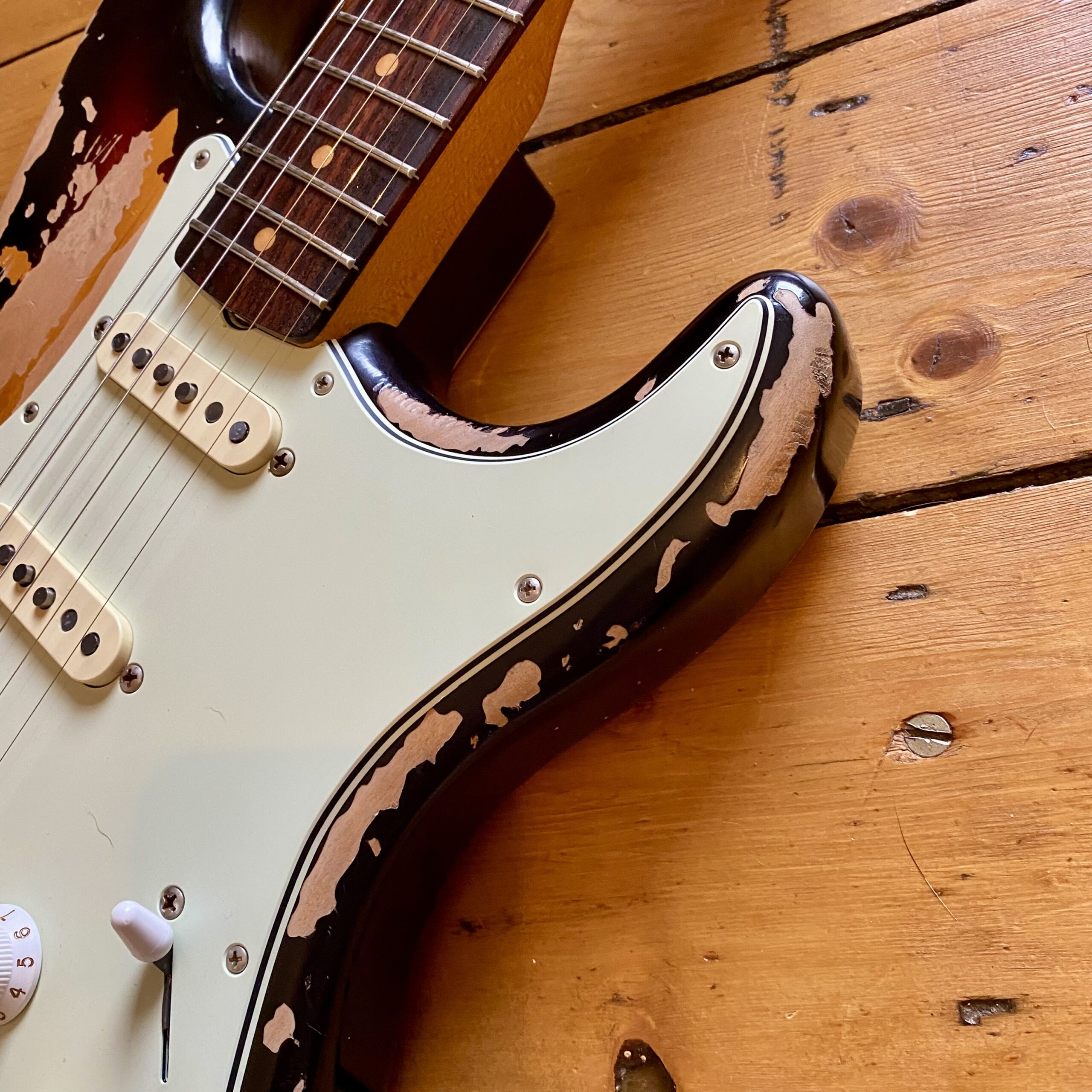 The super comfortable alder nitrocellulose ’60 Strat body and slim C maple neck with slab rosewood fretboard make it a dream for players. The roadworn finish really enhances the comfort and feel of the guitar with lots of additional McReady signature touches.