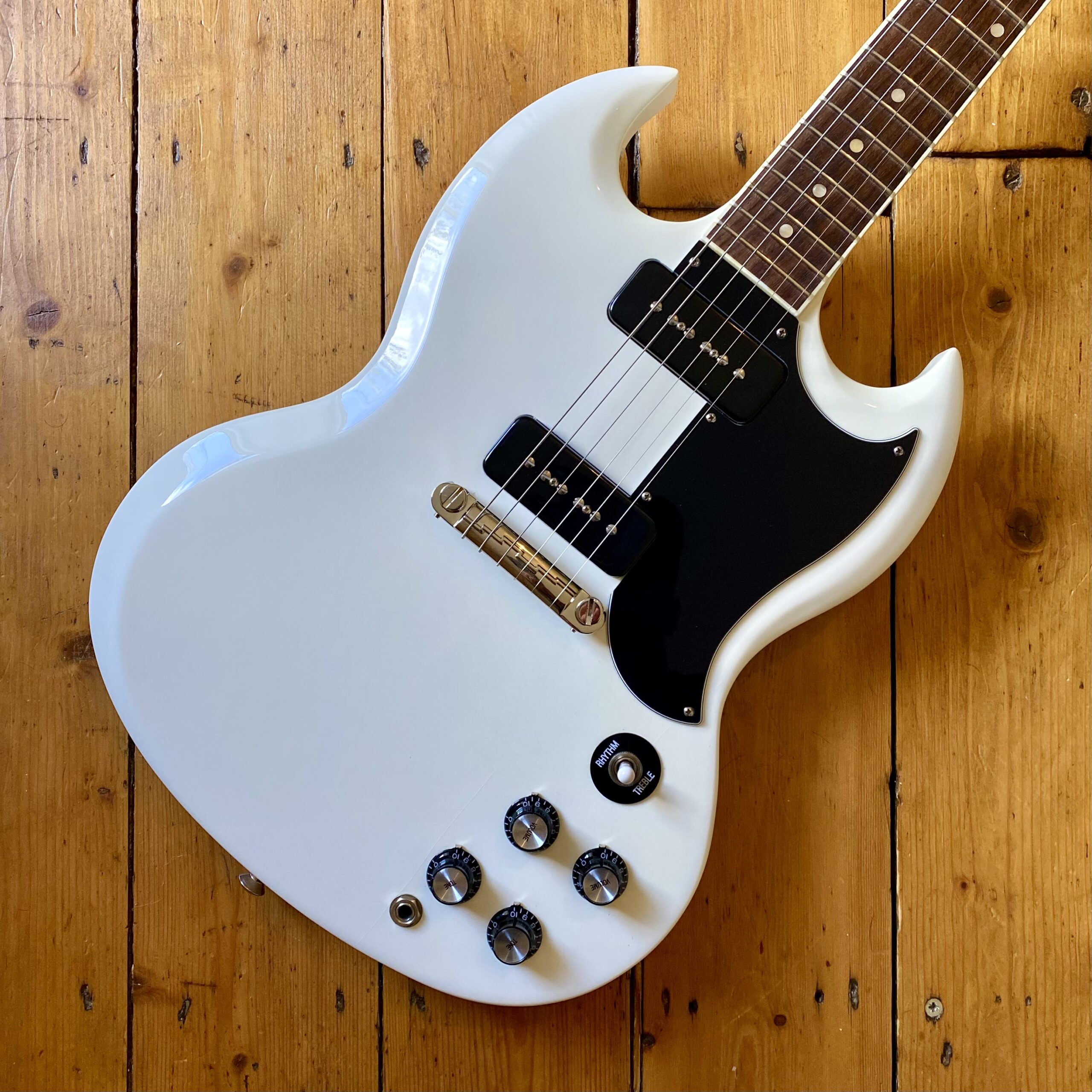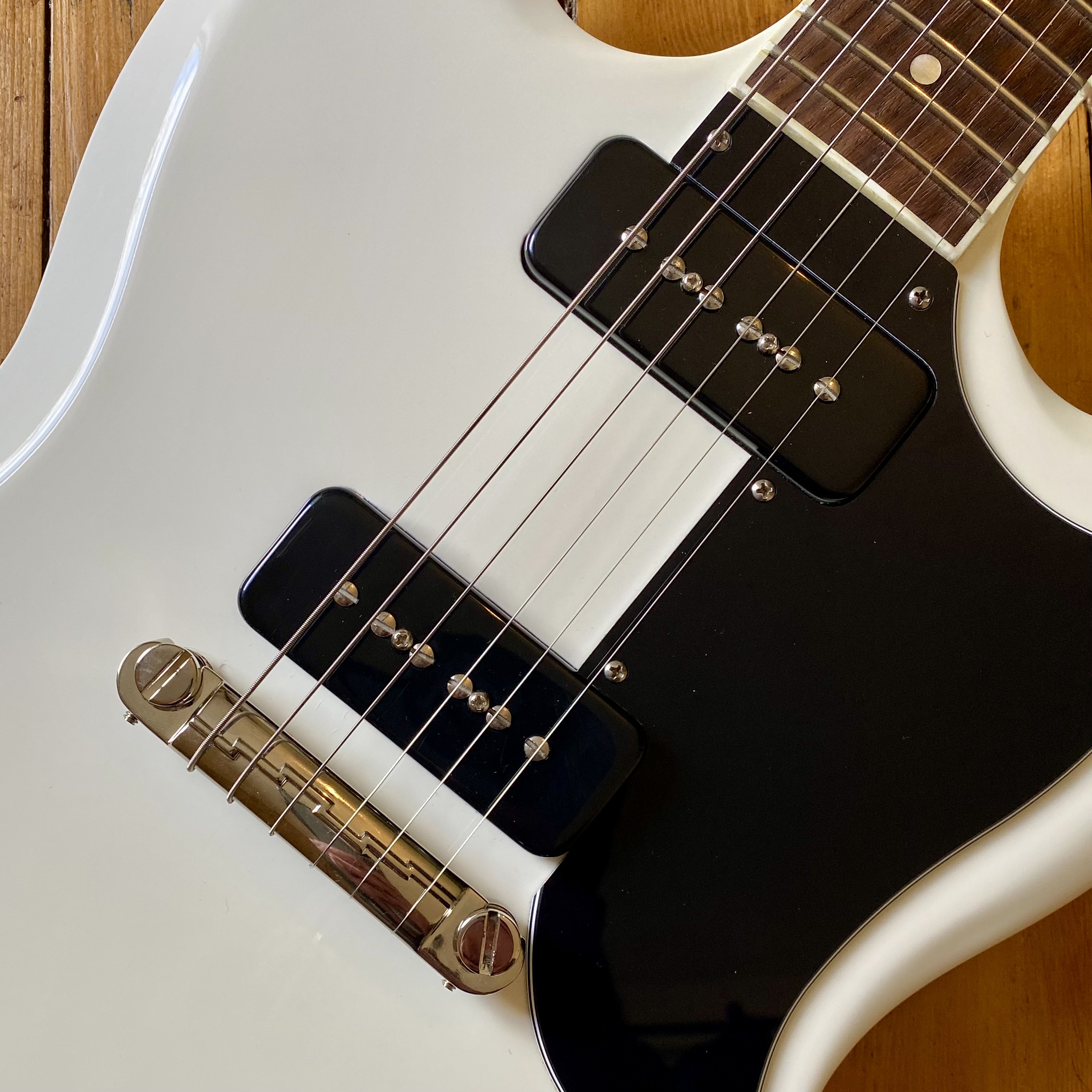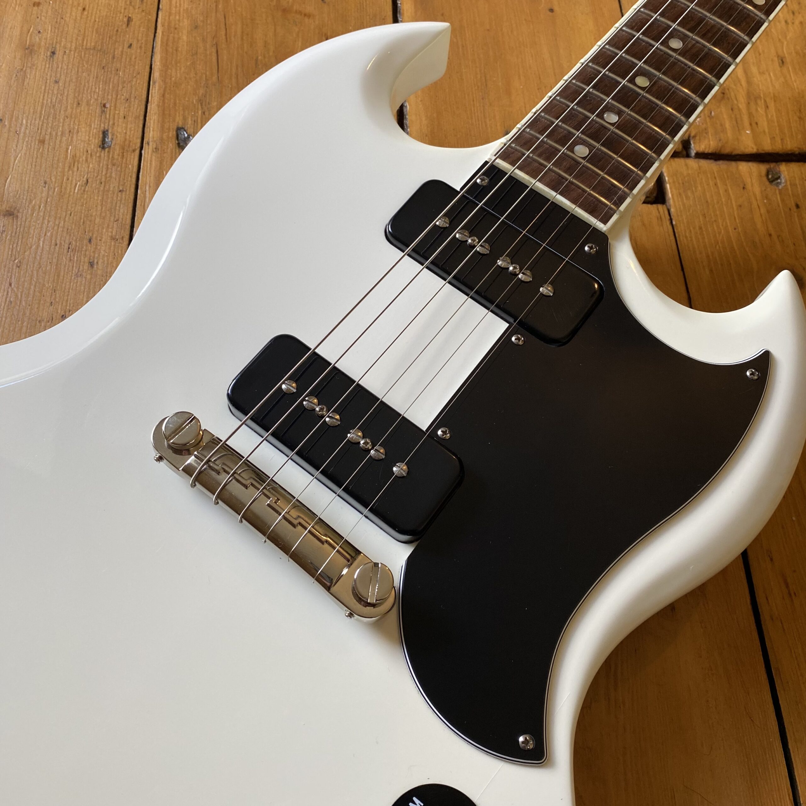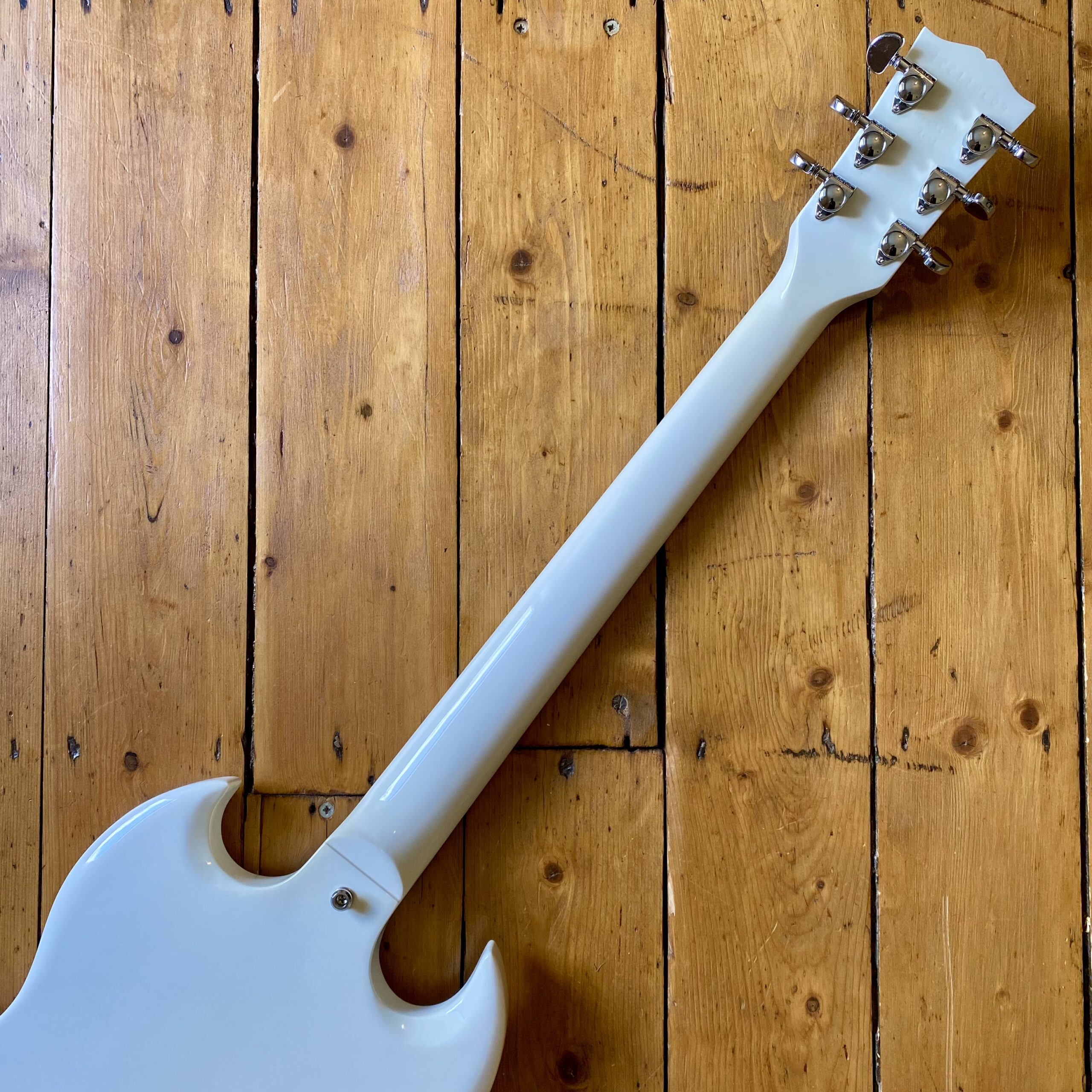 These don’t come up for sale often. This is a 2011, Gibson 50th Anniversary Pete Townshend SG Special in Alpine White to commemorate the 50th anniversary of the Gibson SG and Pete’s later use of Polaris White Gibson SG Specials.