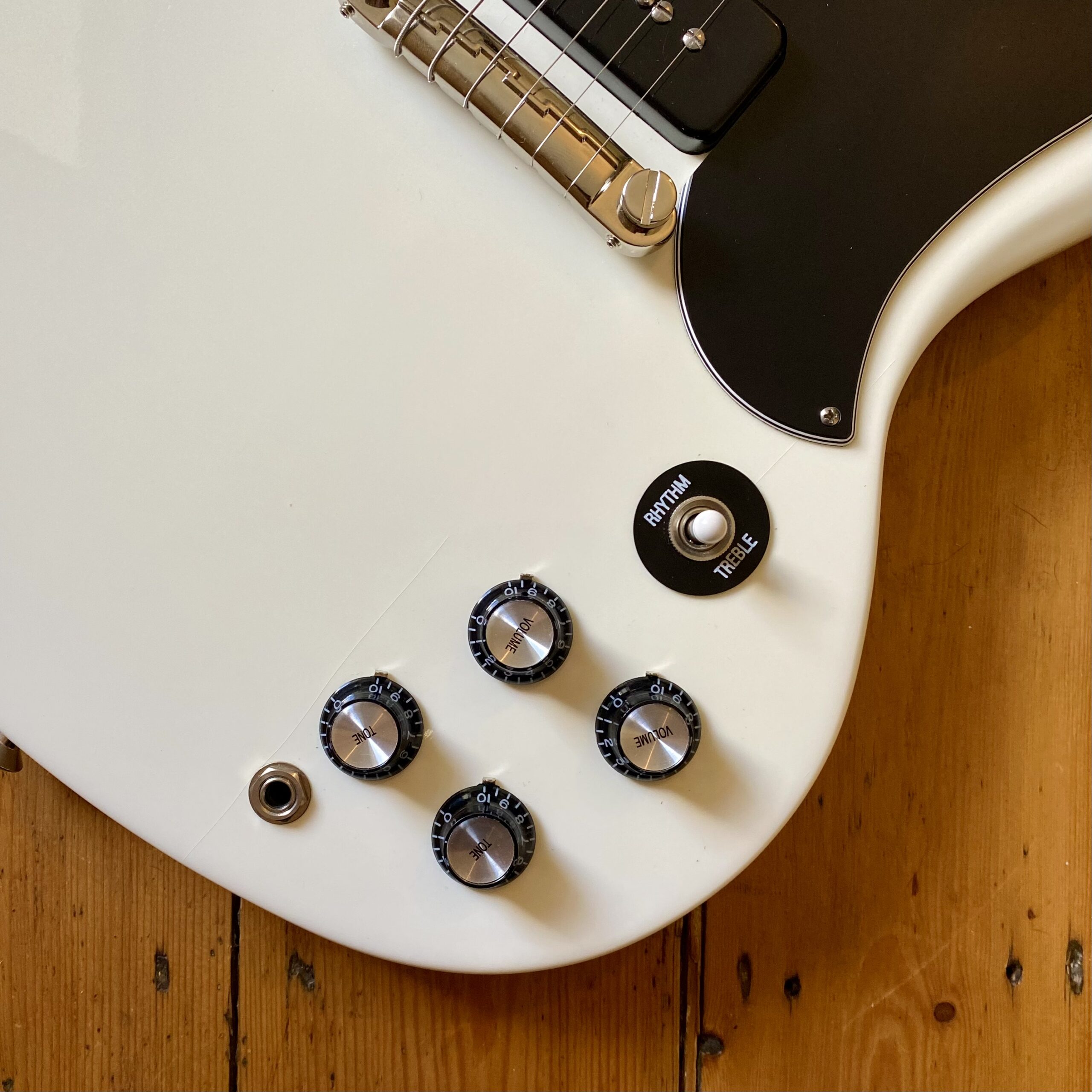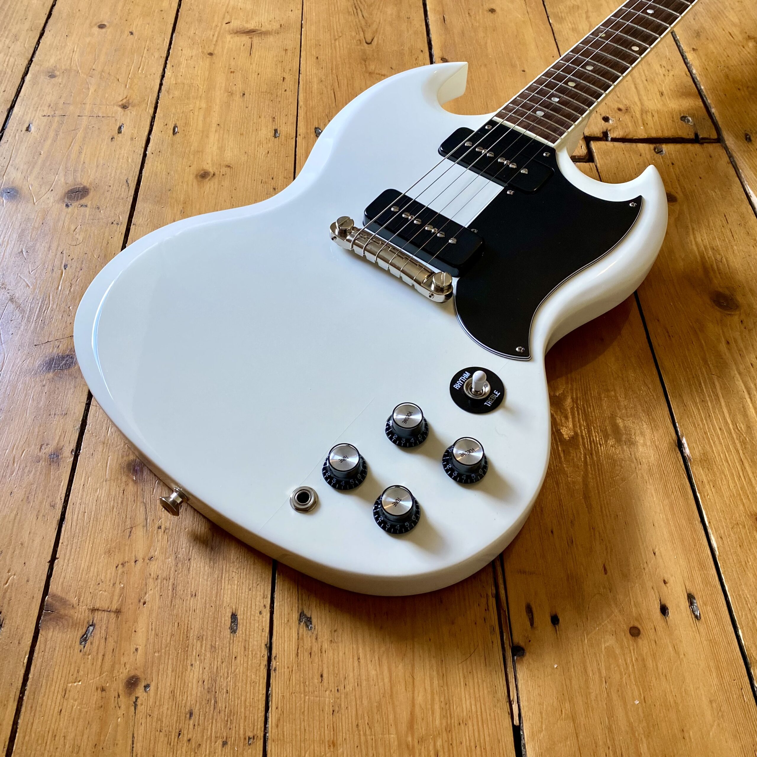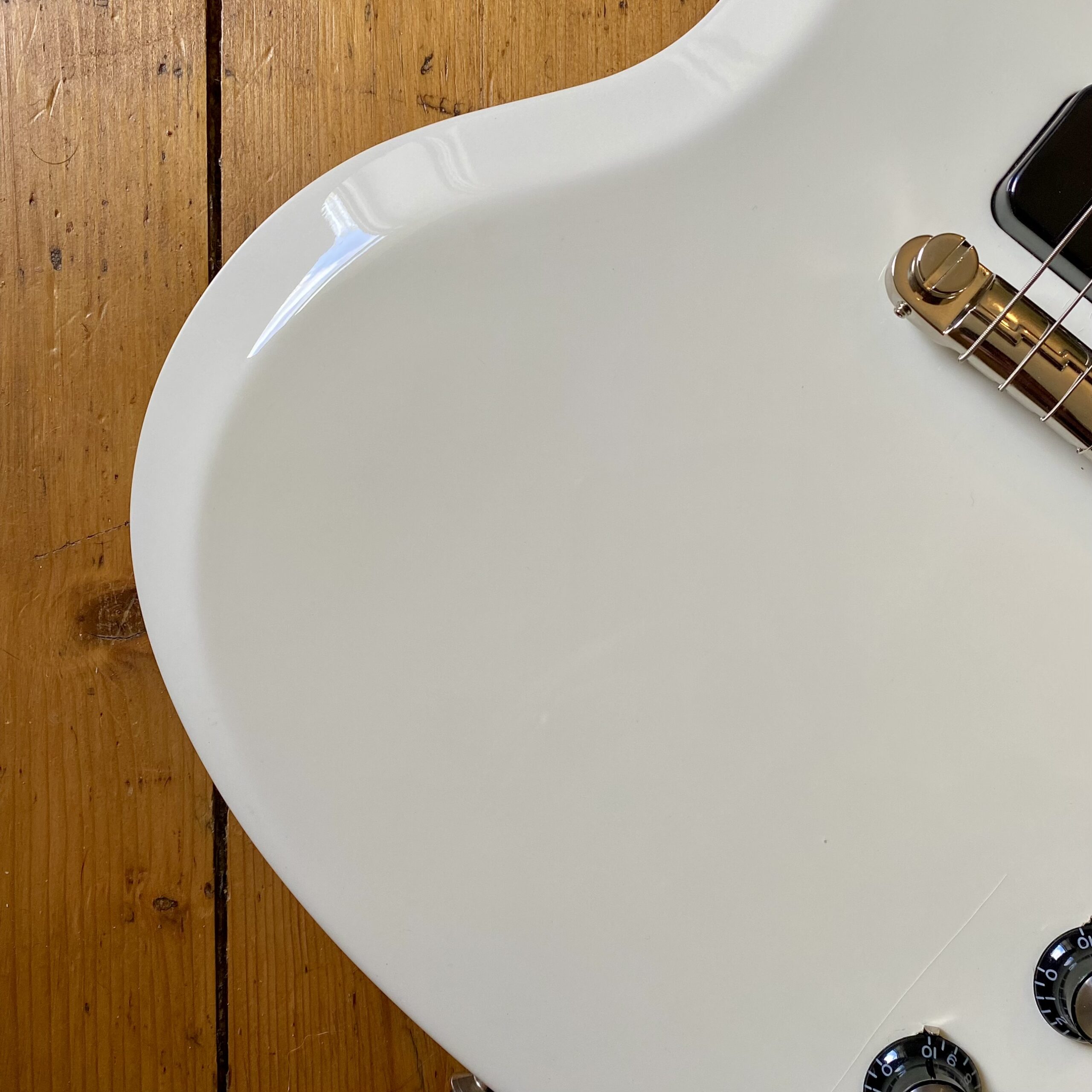 These don’t come up for sale often. This is a 2011, Gibson 50th Anniversary Pete Townshend SG Special in Alpine White to commemorate the 50th anniversary of the Gibson SG and Pete’s later use of Polaris White Gibson SG Specials.