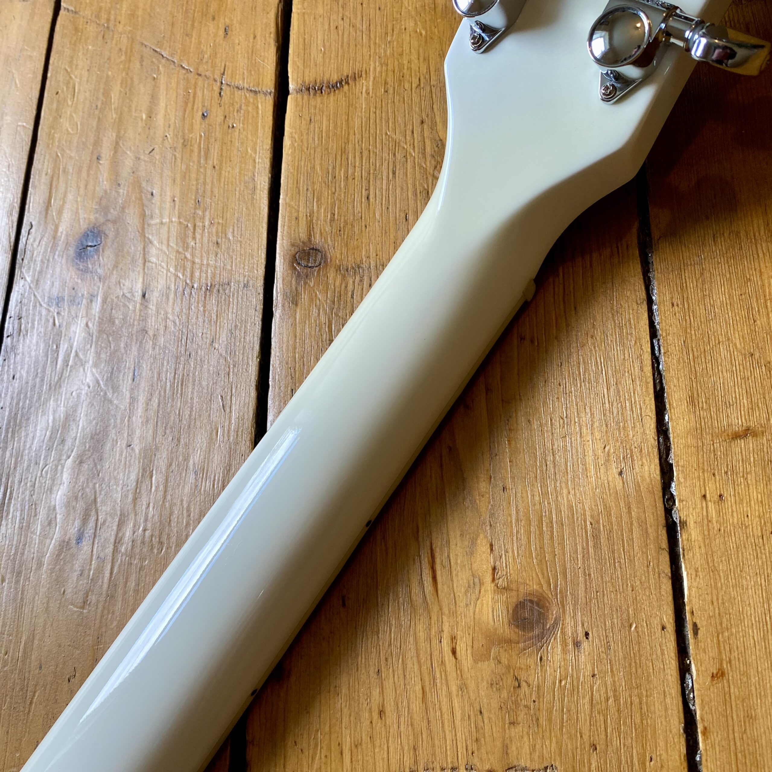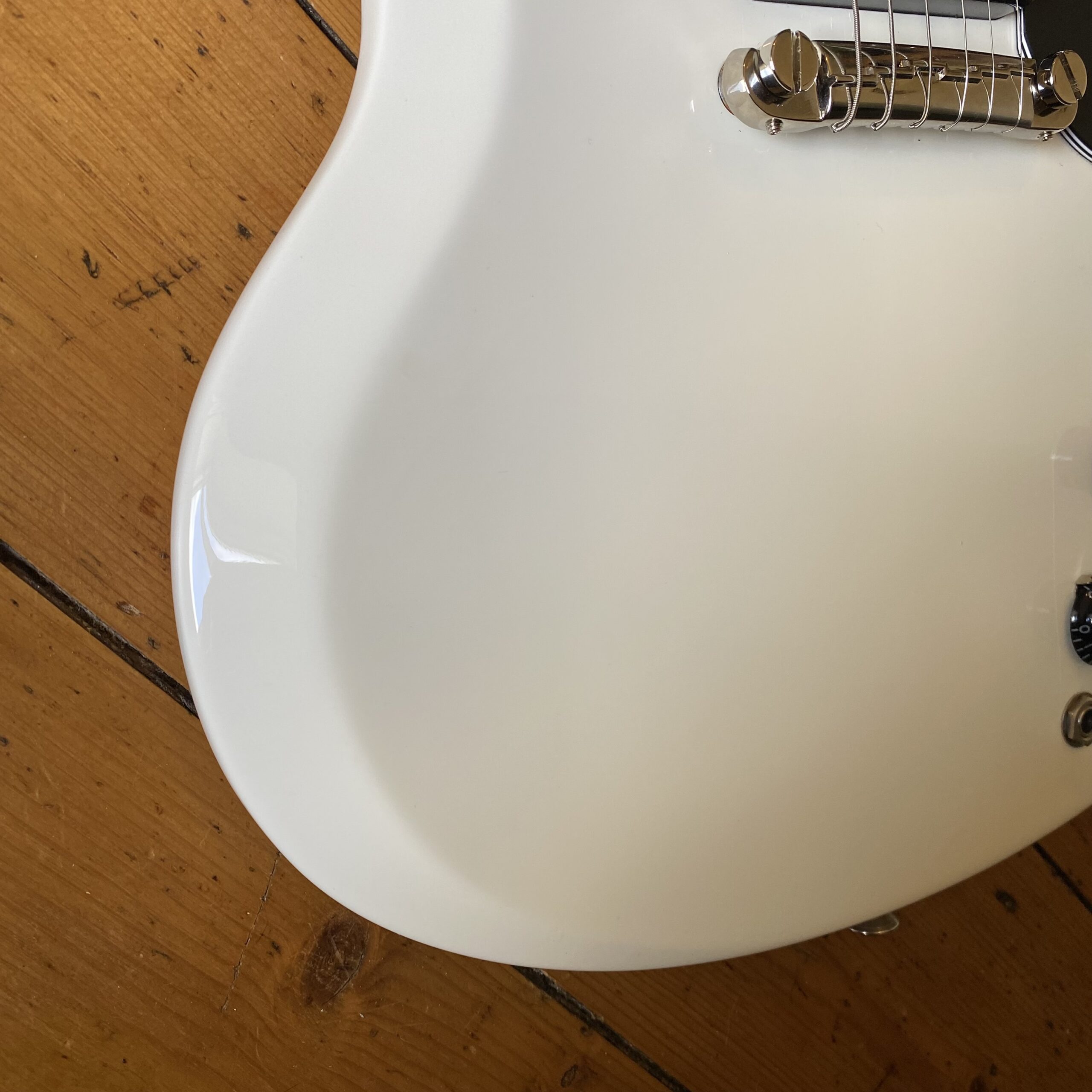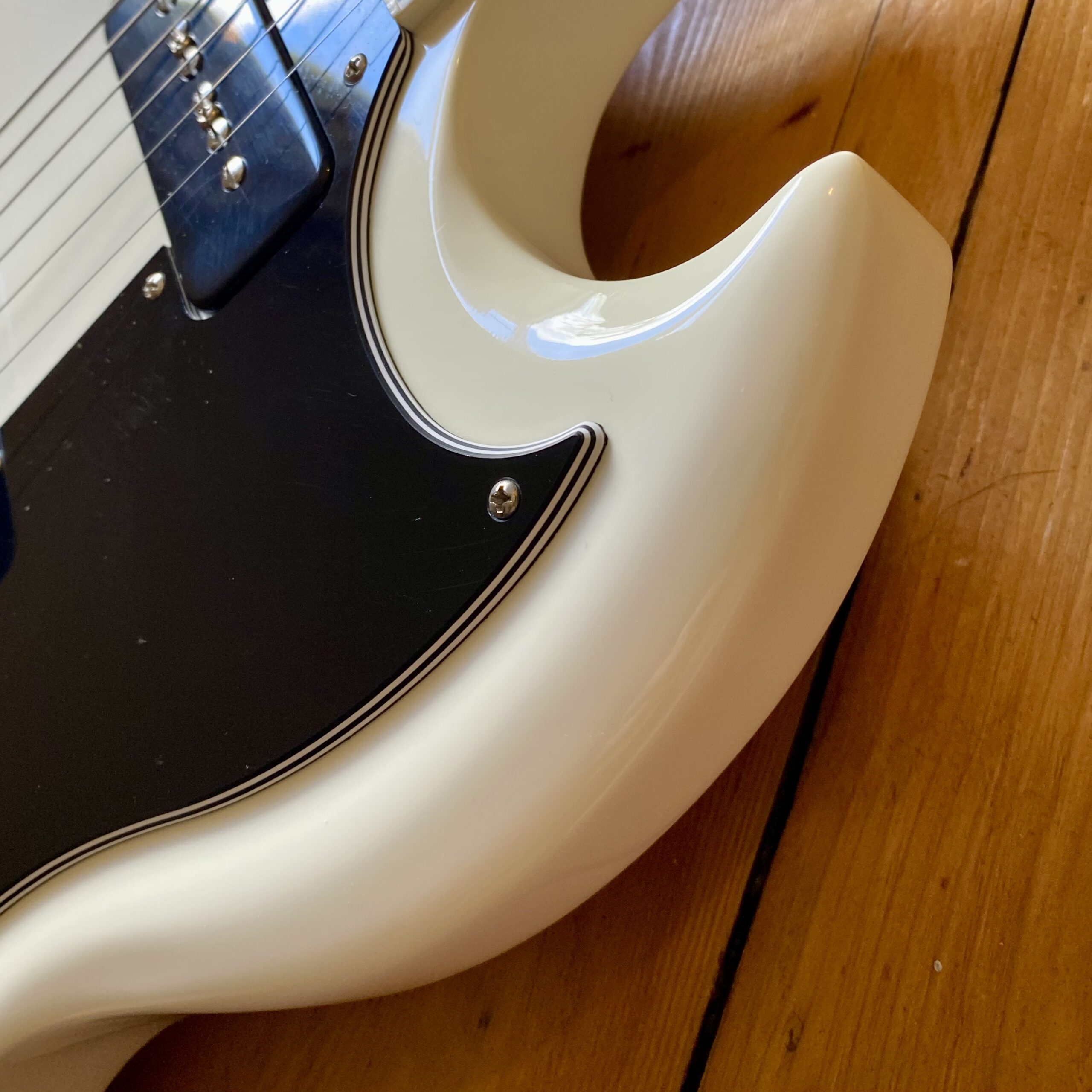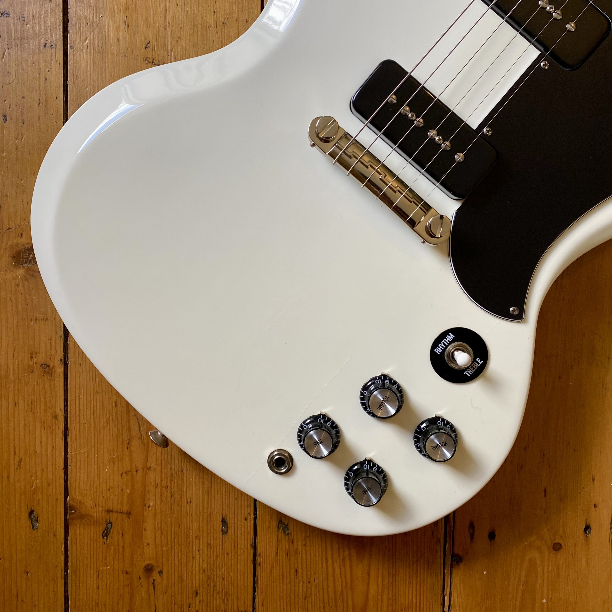 These don’t come up for sale often. This is a 2011, Gibson 50th Anniversary Pete Townshend SG Special in Alpine White to commemorate the 50th anniversary of the Gibson SG and Pete’s later use of Polaris White Gibson SG Specials.