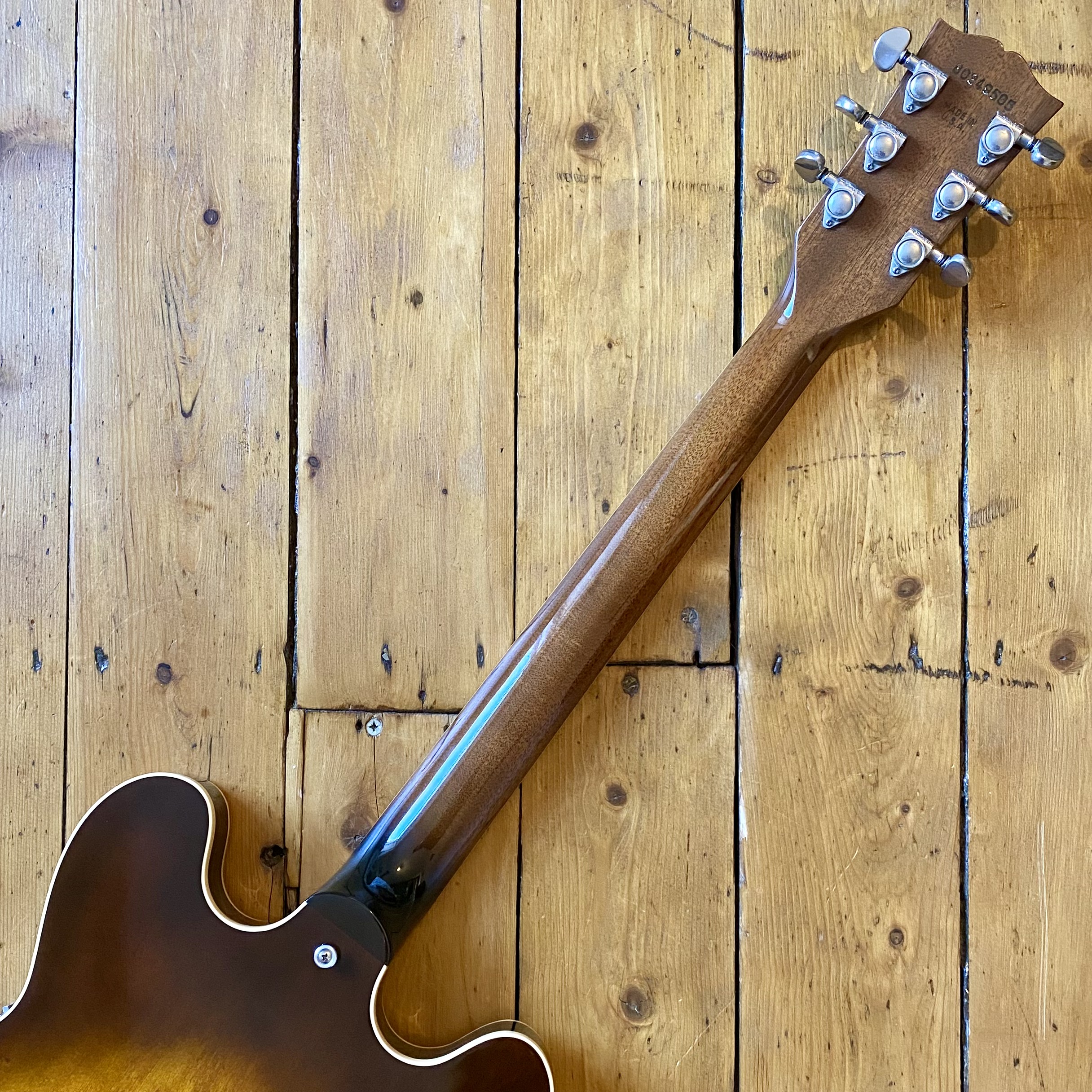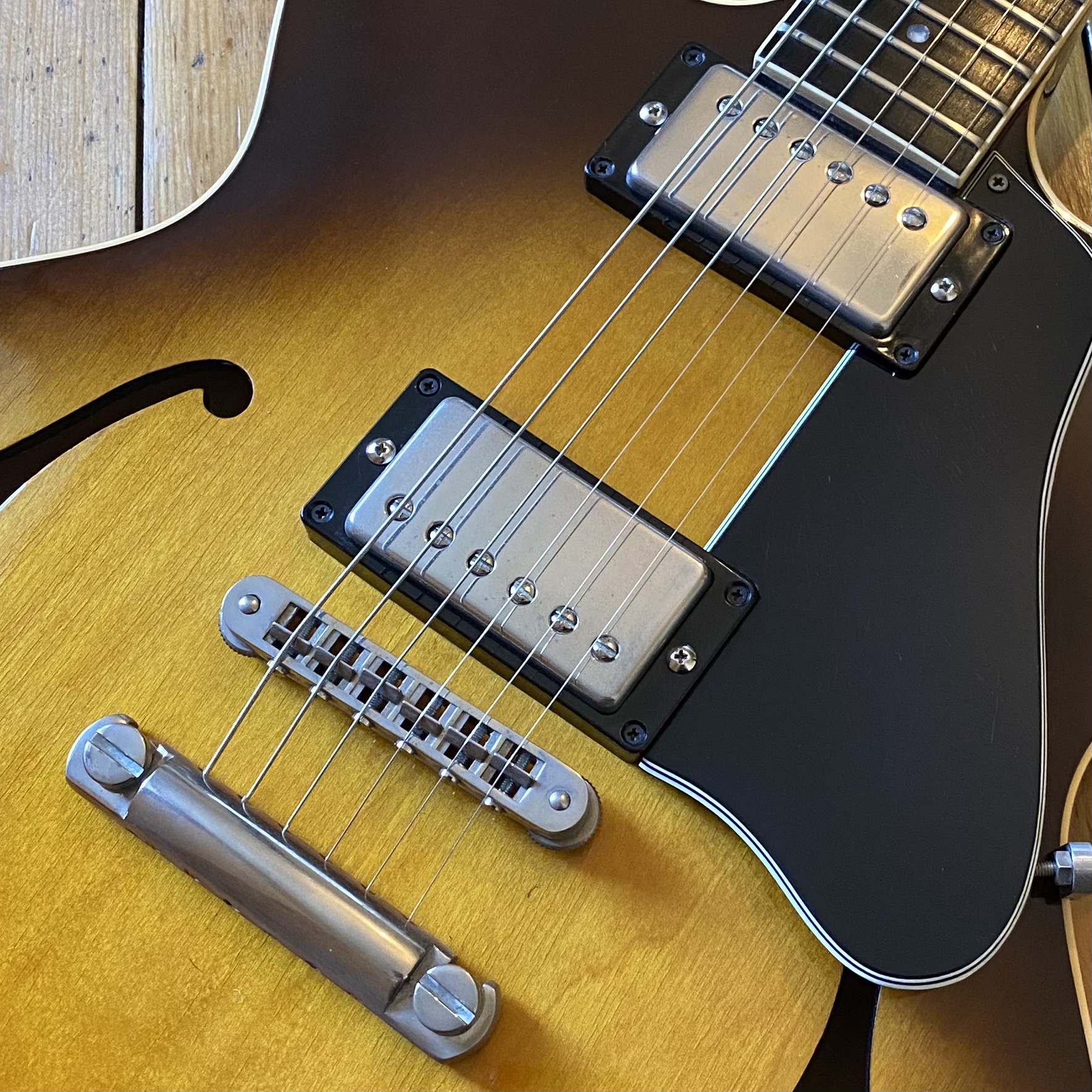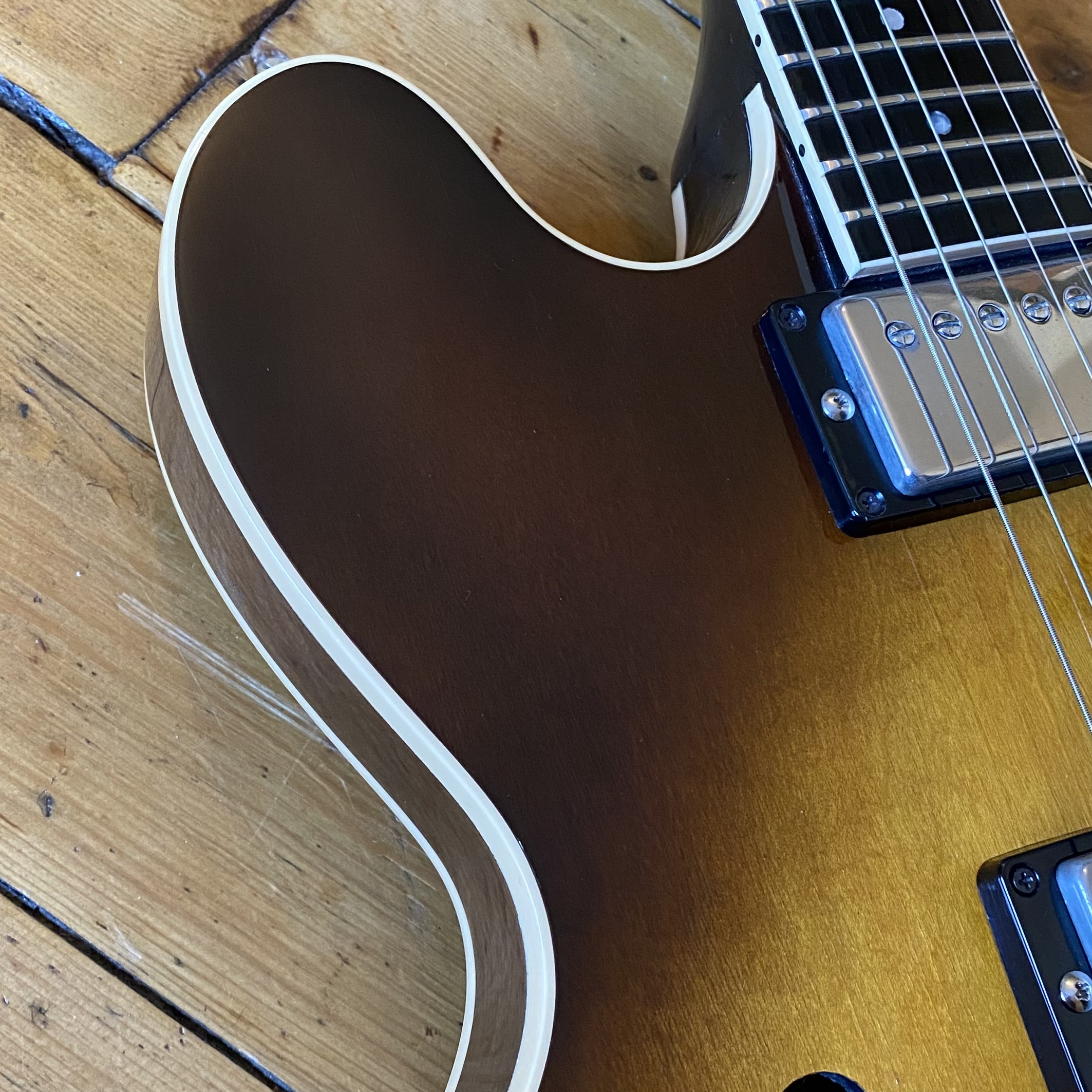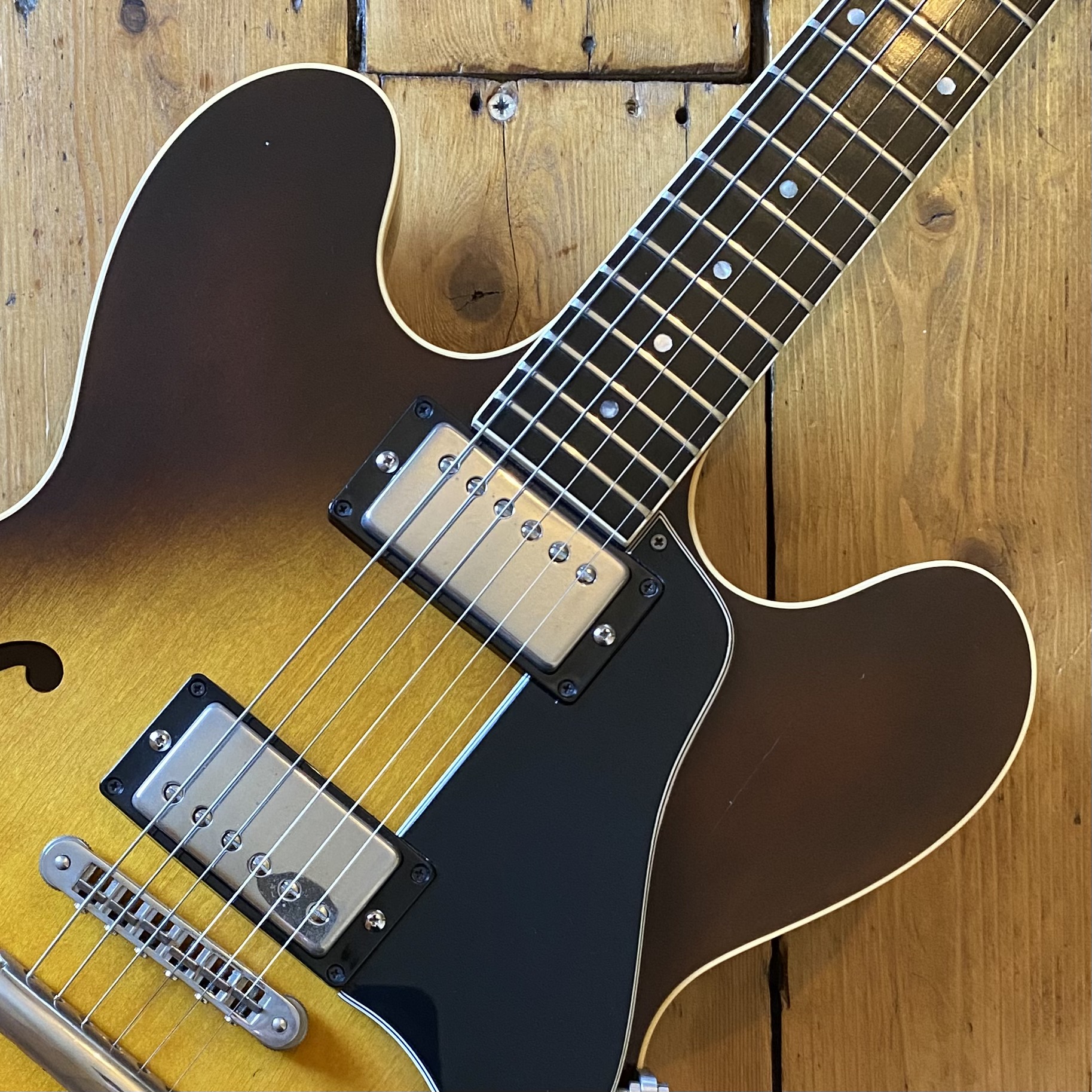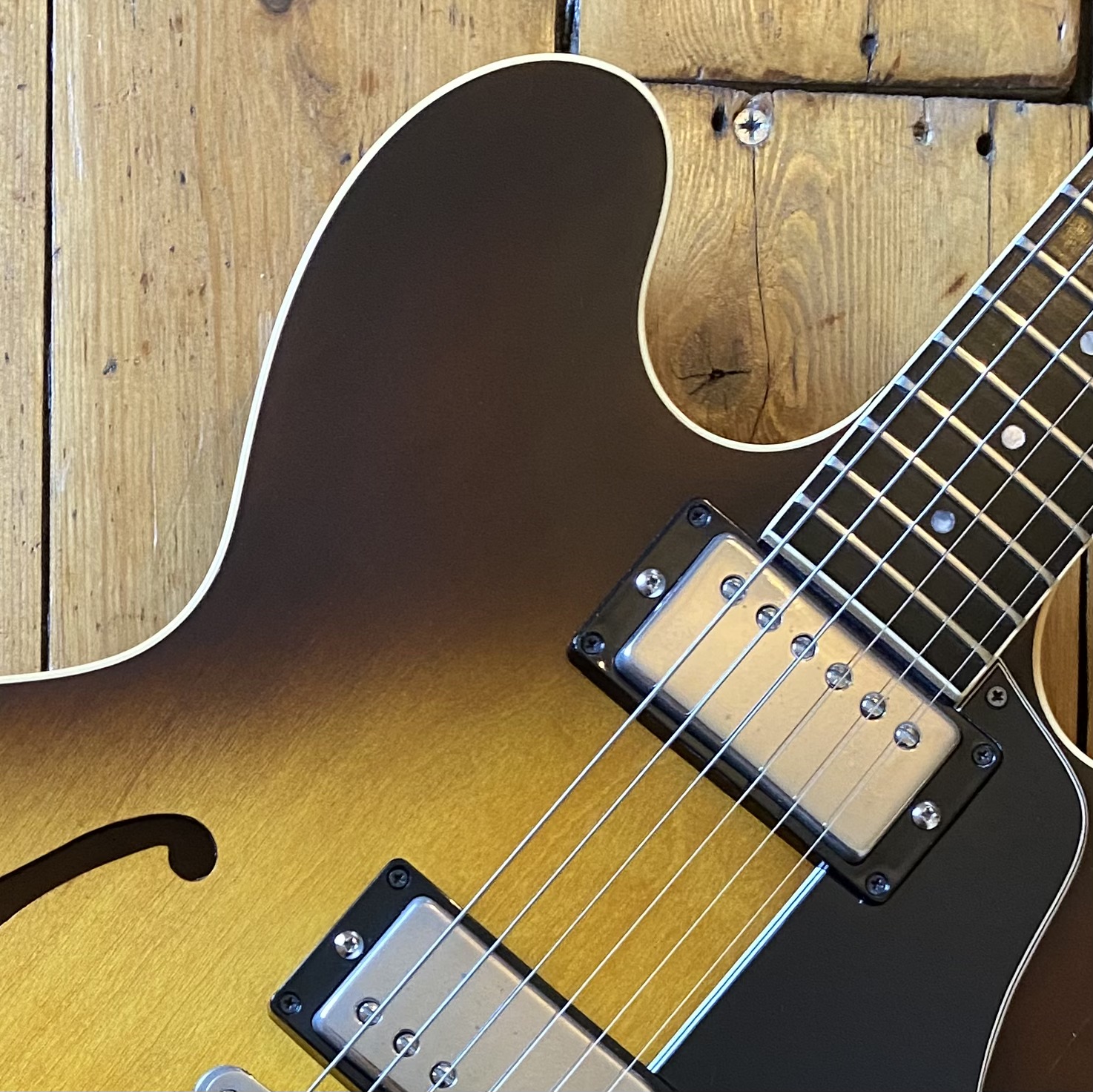 – double round cutaway semi-hollow maple body with mahogany centre block
