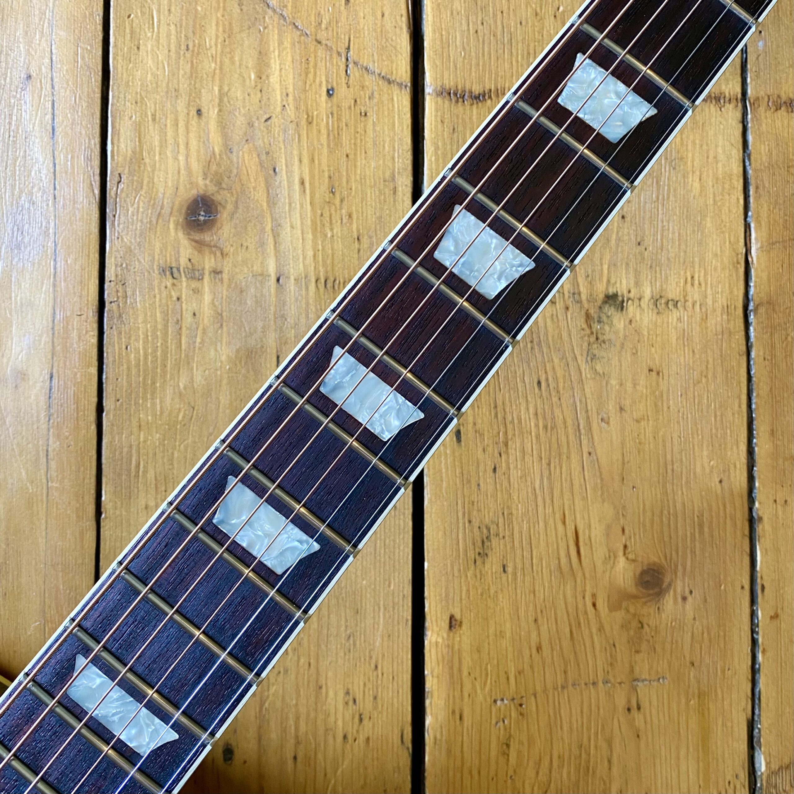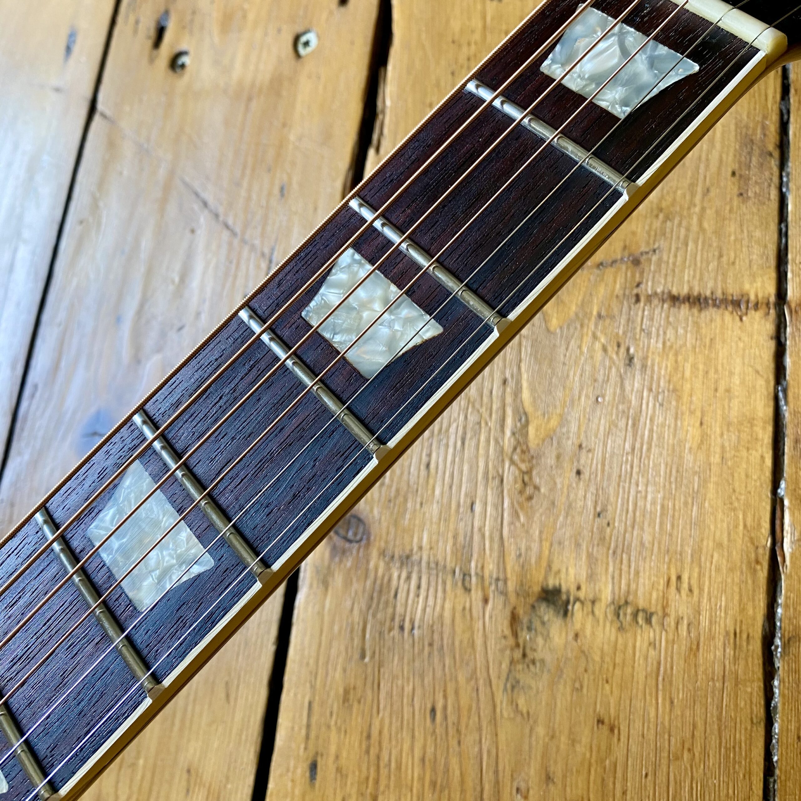 The one-piece mahogany neck has a C-shaped carve with well-rounded shoulders. The bound rosewood fretboard features pearloid trapezoid inlays, with medium jumbo frets. These are in factory condition just like the rest of the guitar. The Kluson-style tuners turn smoothly and hold accurate pitch, with lightly greened keystone buttons.