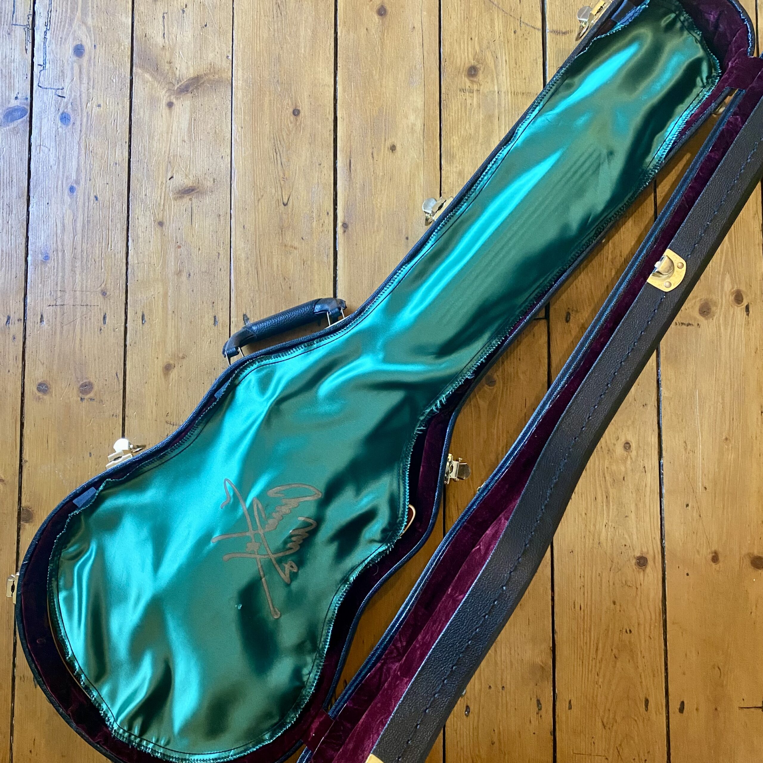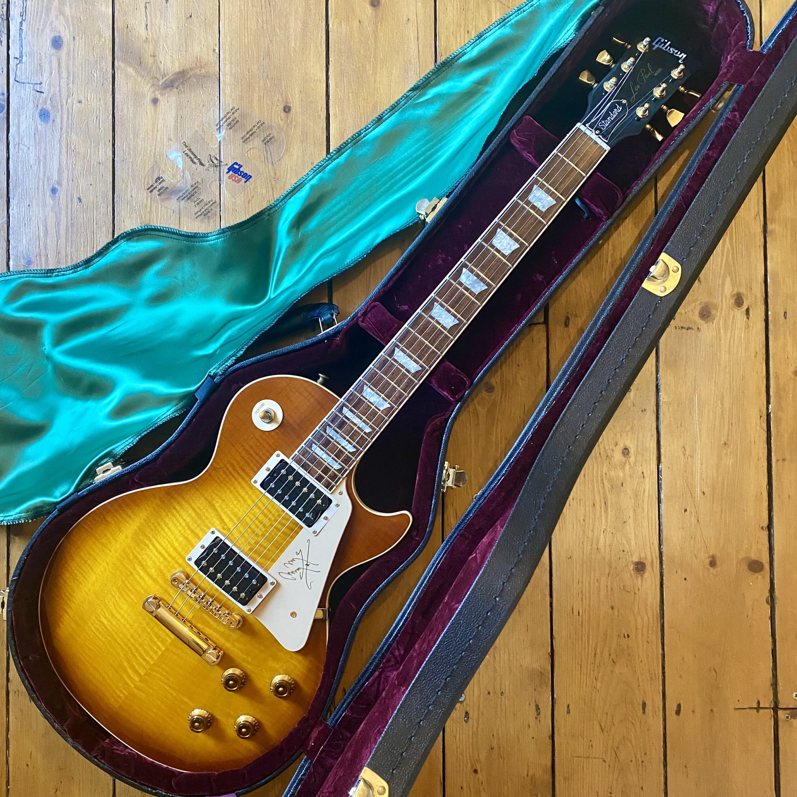 The factory Gibson Custom Shop case supplied with the guitar is a nice additional detail. This typically happened in very late 96 when Gibson ran out of the green lined “Gibson” standard case, this meant you’d get a Gibson Custom Shop case along with the all important Page signature green shroud.
