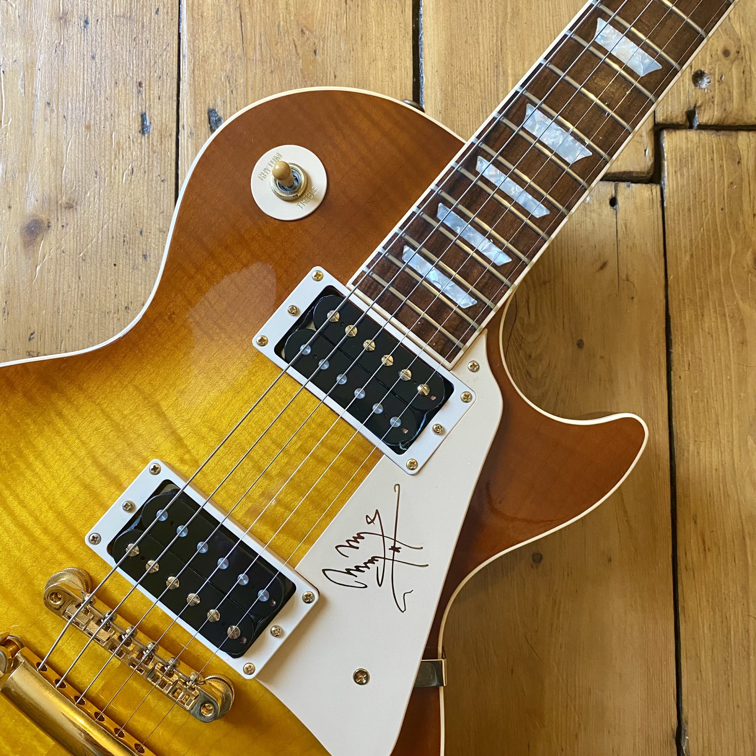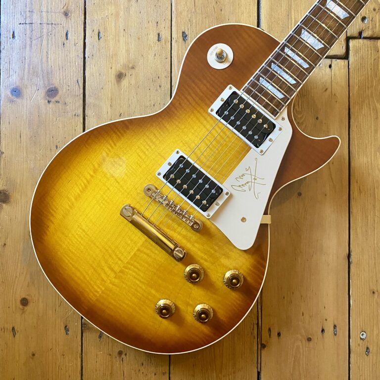 Based on the legendary Led Zeppelin guitarists original 1959 Les Paul, this guitar is part of the first run Gibson produced with Page from 1995 to 1999. The model proved to be very popular and would lead to many further collaborations between Page and Gibson through the years. This 1990s edition was the very first Jimmy Page Signature model, based on a Les Paul Standard with a highly figured top, custom neck profile, custom colour and using the first Gibson ceramic pickups. It features Jimmy’s signature on the pickguard, gold hardware, Grover tuners, and push-pull knobs for coil-tapping/phasing options.