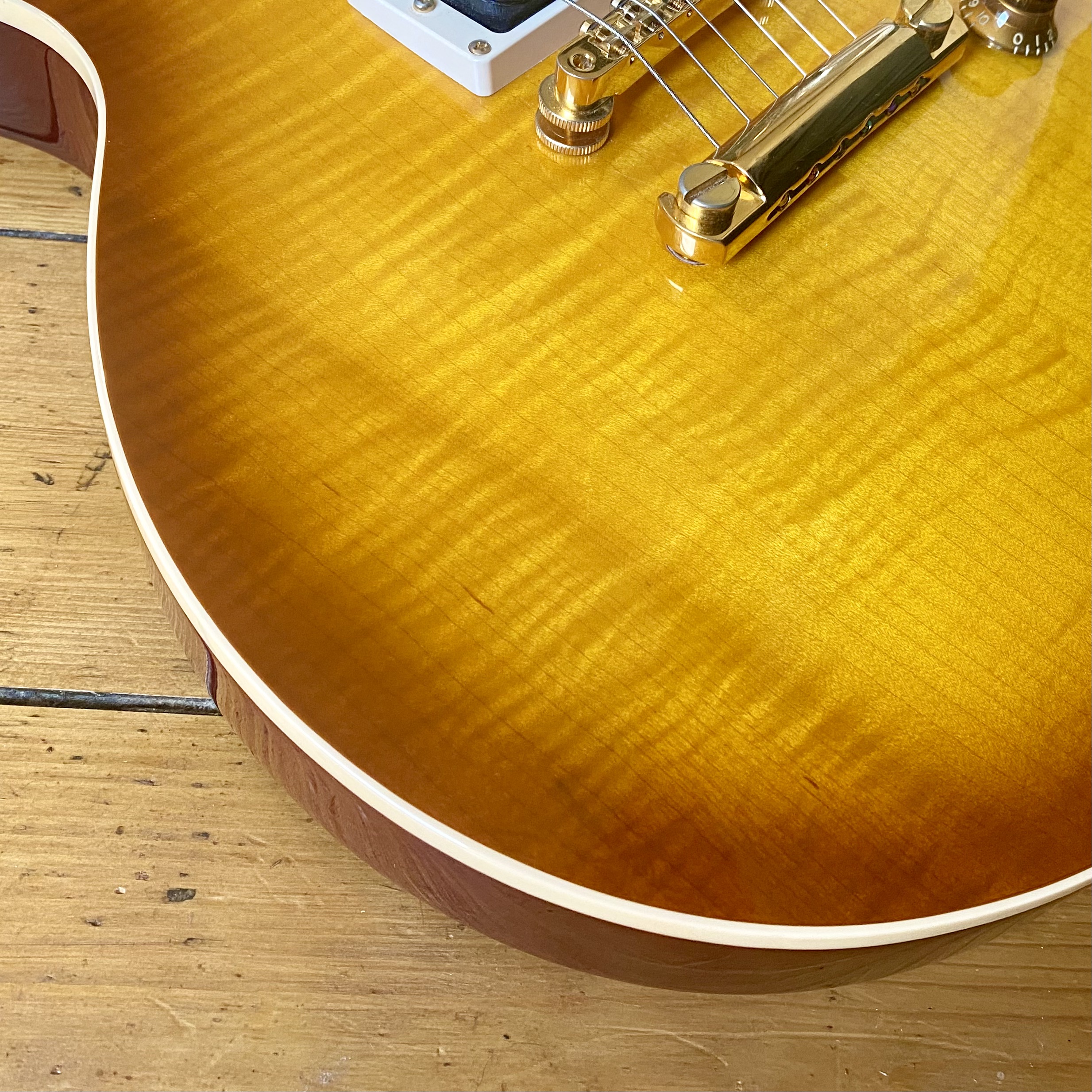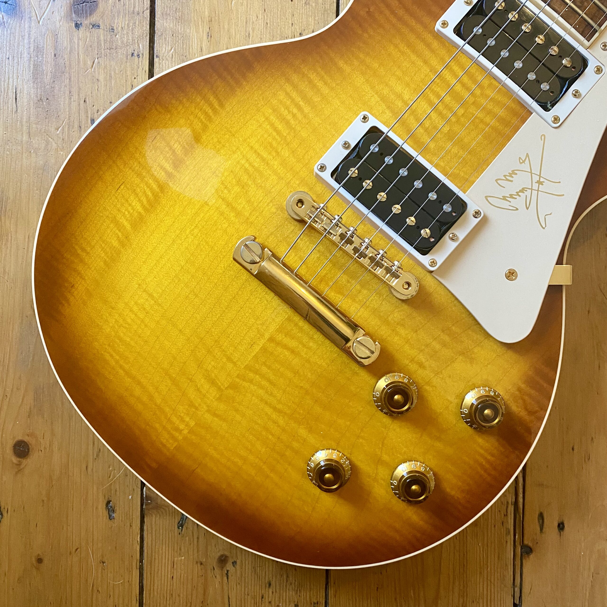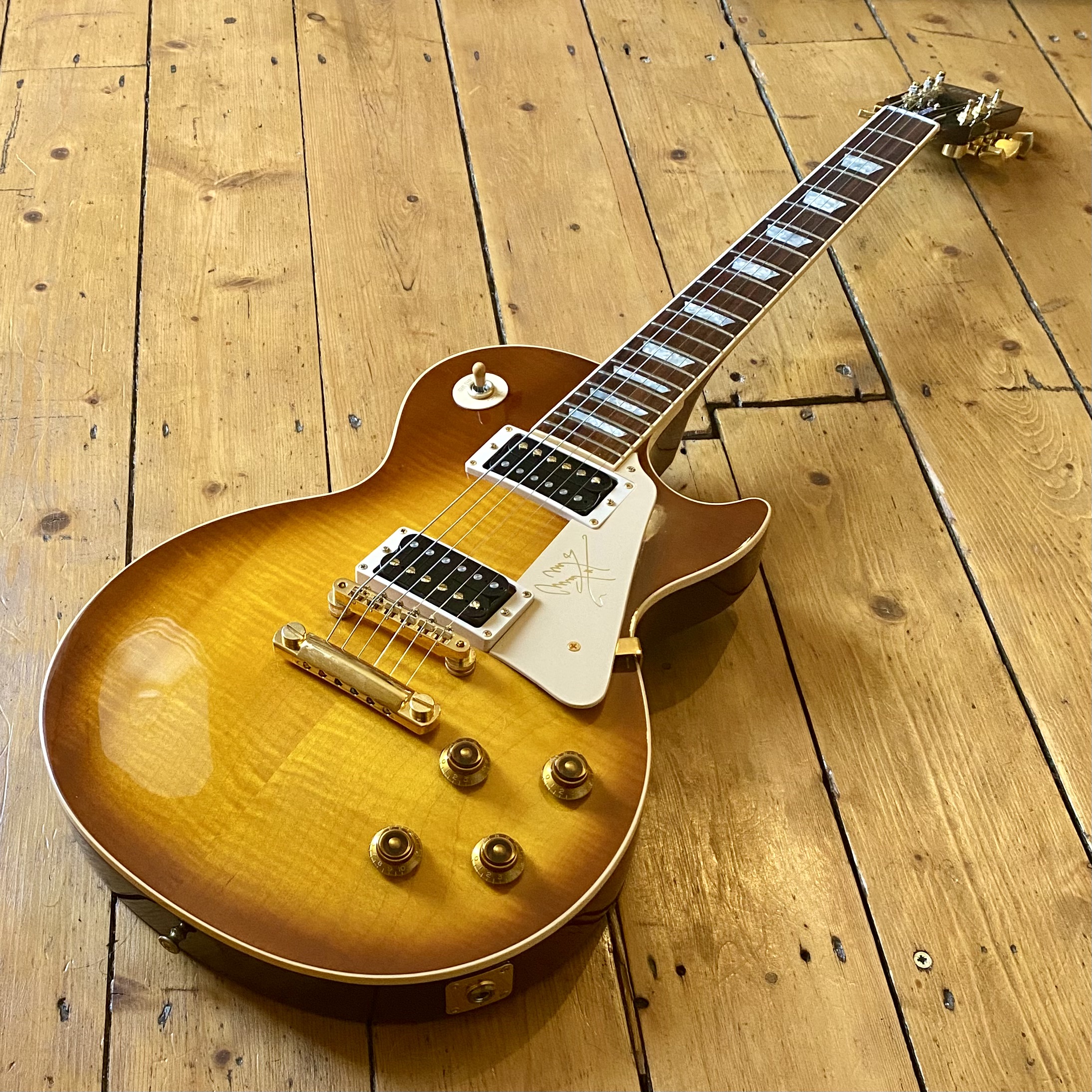 It’s easy to see why the model became so popular with this example in particular featuring a figured, tight flame maple top; solid mahogany body and neck, rosewood fingerboard with trapezoid inlays and finished in a light honey burst that really shows off the exceptional flame of this guitar. Hardware is Gold plated throughout from the Kluson tuners to the ABR-1 and stoptail, the plating is in excellent condition with no wear and no pitting. The Jimmy Page signature cream pickguard is in excellent condition with minimal wear.