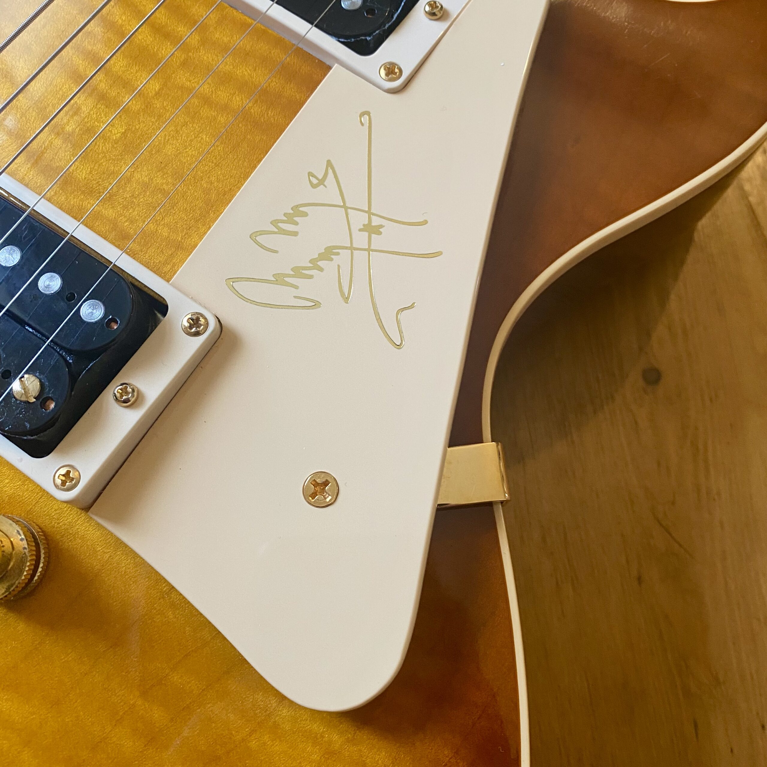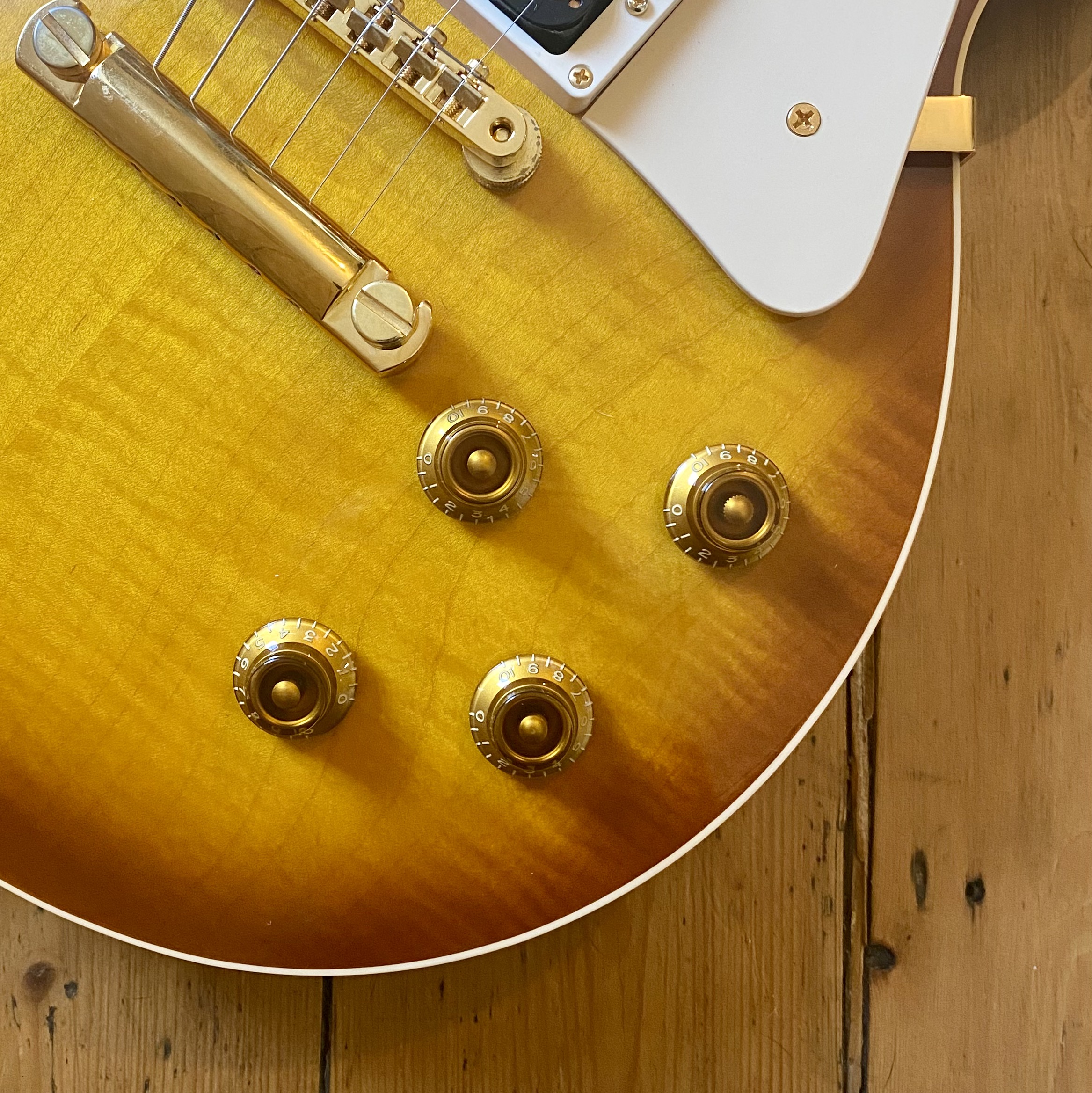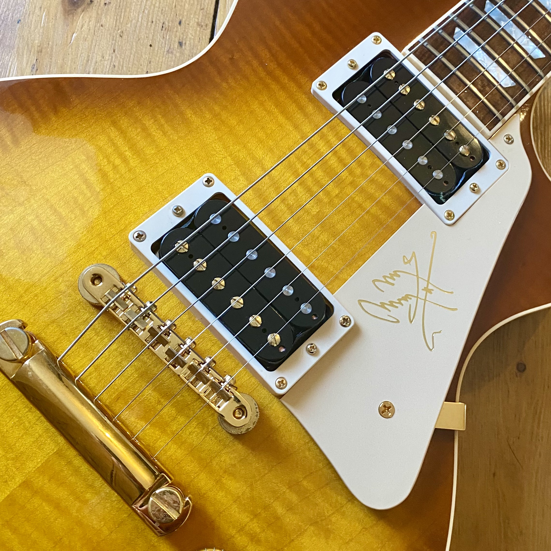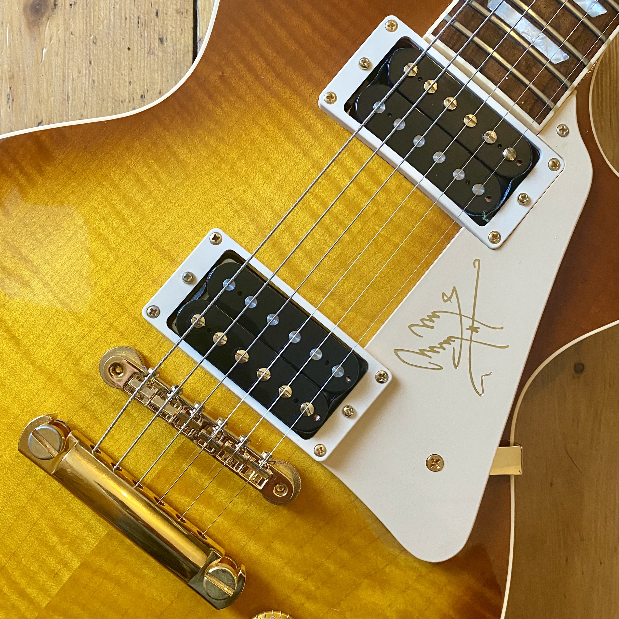 It’s easy to see why the model became so popular with this example in particular featuring a figured, tight flame maple top; solid mahogany body and neck, rosewood fingerboard with trapezoid inlays and finished in a light honey burst that really shows off the exceptional flame of this guitar. Hardware is Gold plated throughout from the Kluson tuners to the ABR-1 and stoptail, the plating is in excellent condition with no wear and no pitting. The Jimmy Page signature cream pickguard is in excellent condition with minimal wear.
