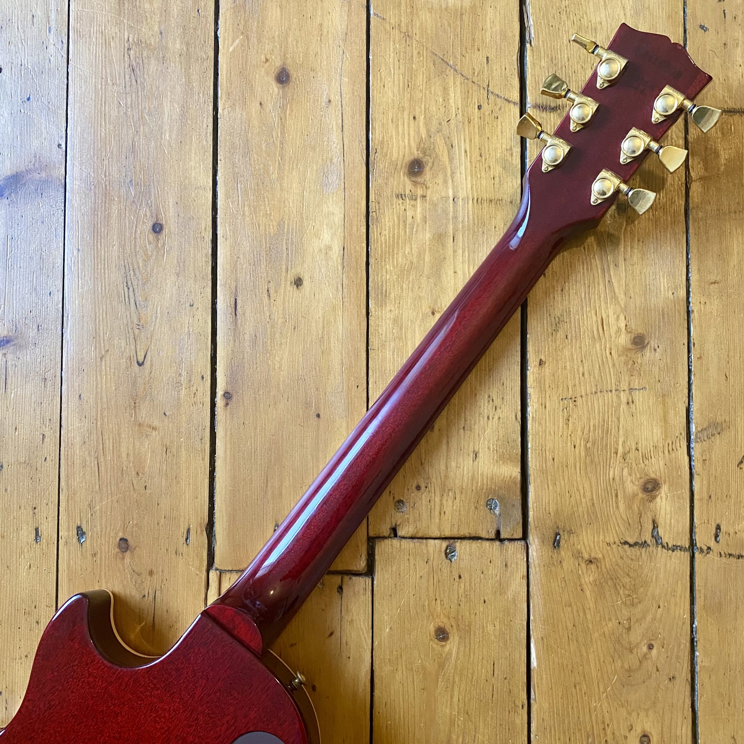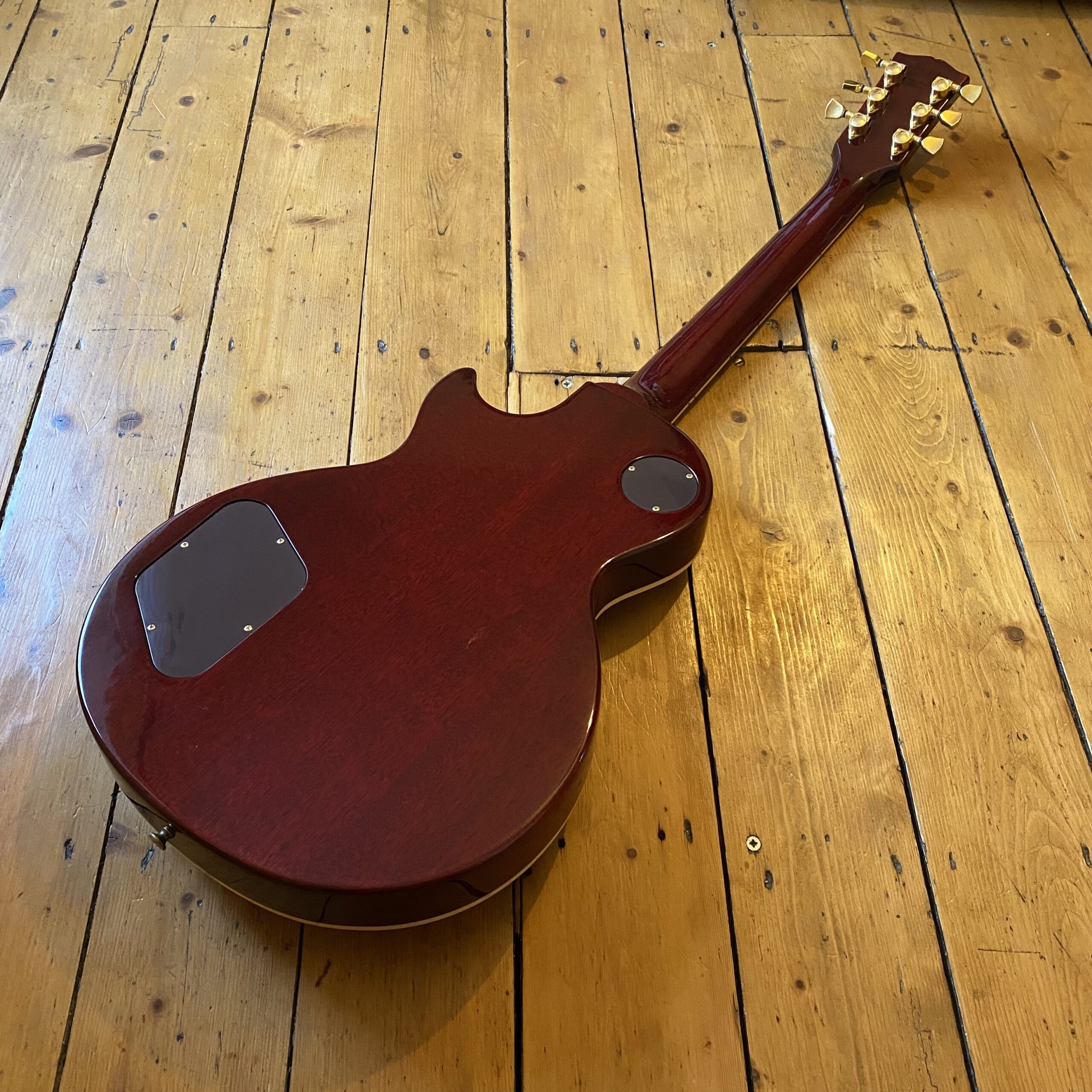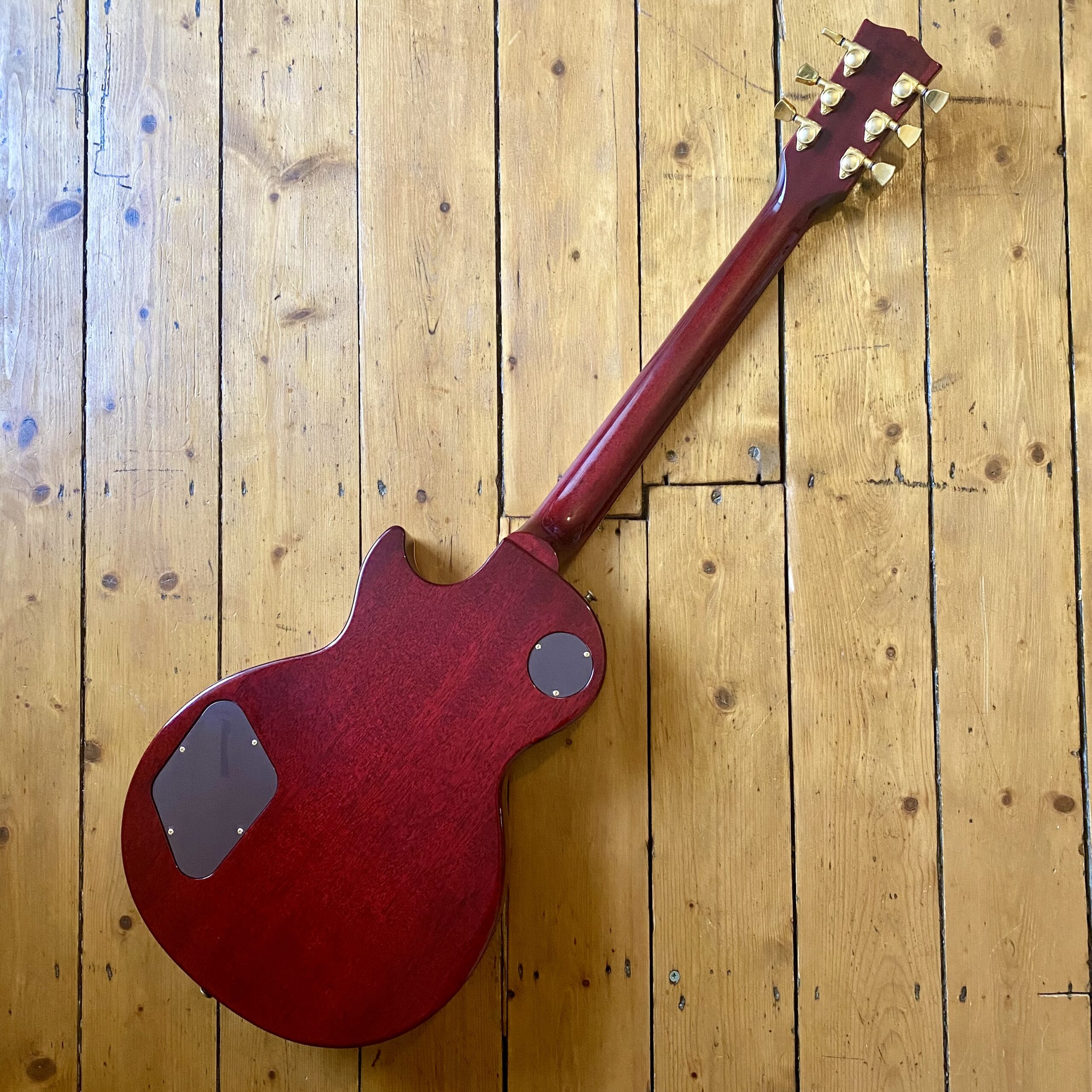 The electronics allow for an amazing 21 tonal variations thanks to the volume and tone knobs push-pull function, three-way-switch and uncovered Gibson 496R and 500T humbuckers. The guitar retains its clear plastic control layout controls. The headstock front hasn’t got the usual haze and lacquer lift you typically see on nineties Gibson finishes either. The only thing of note to speak of is a very minor ding to the back of the guitar (pictured). Otherwise the guitar is in exceptional condition for a 30year old guitar.