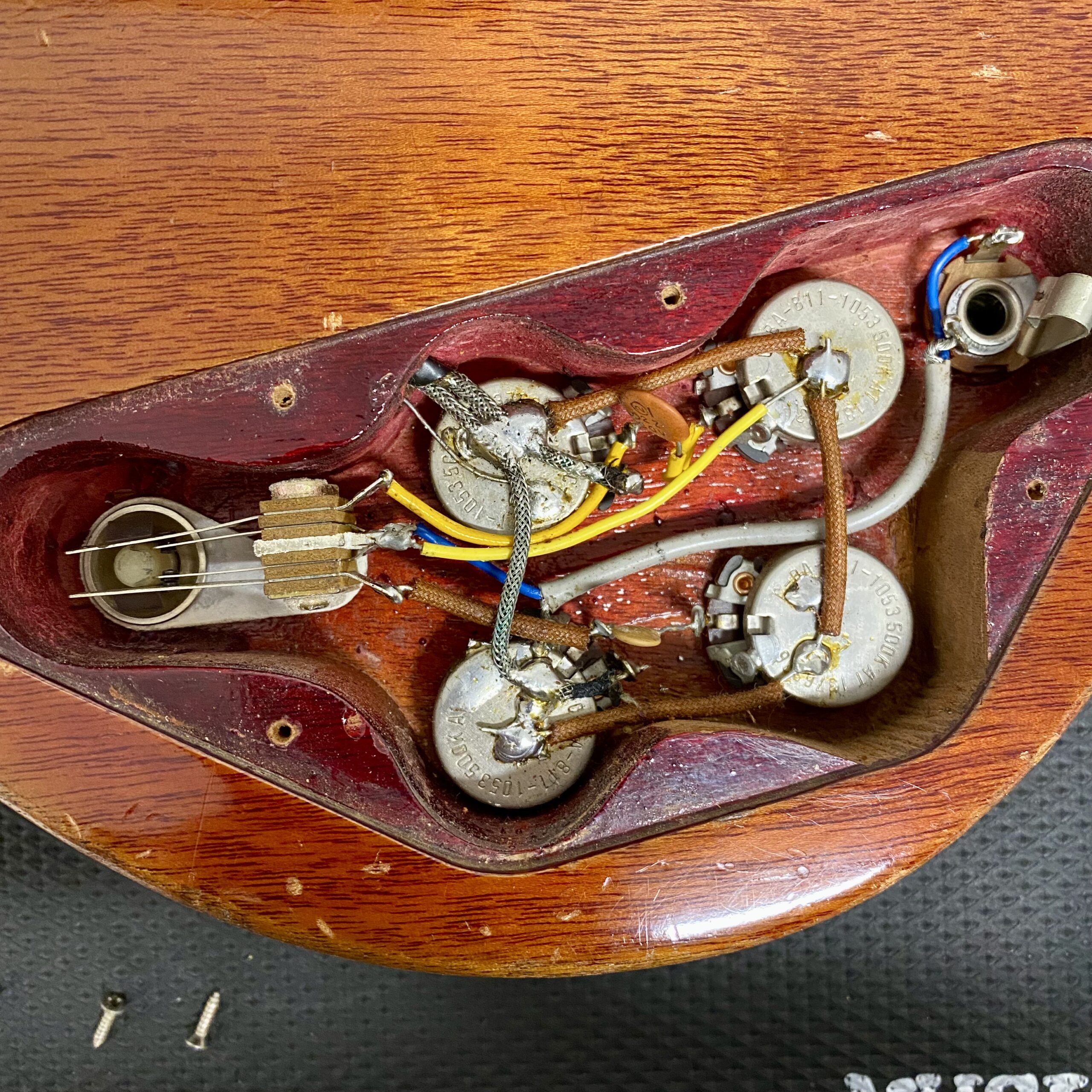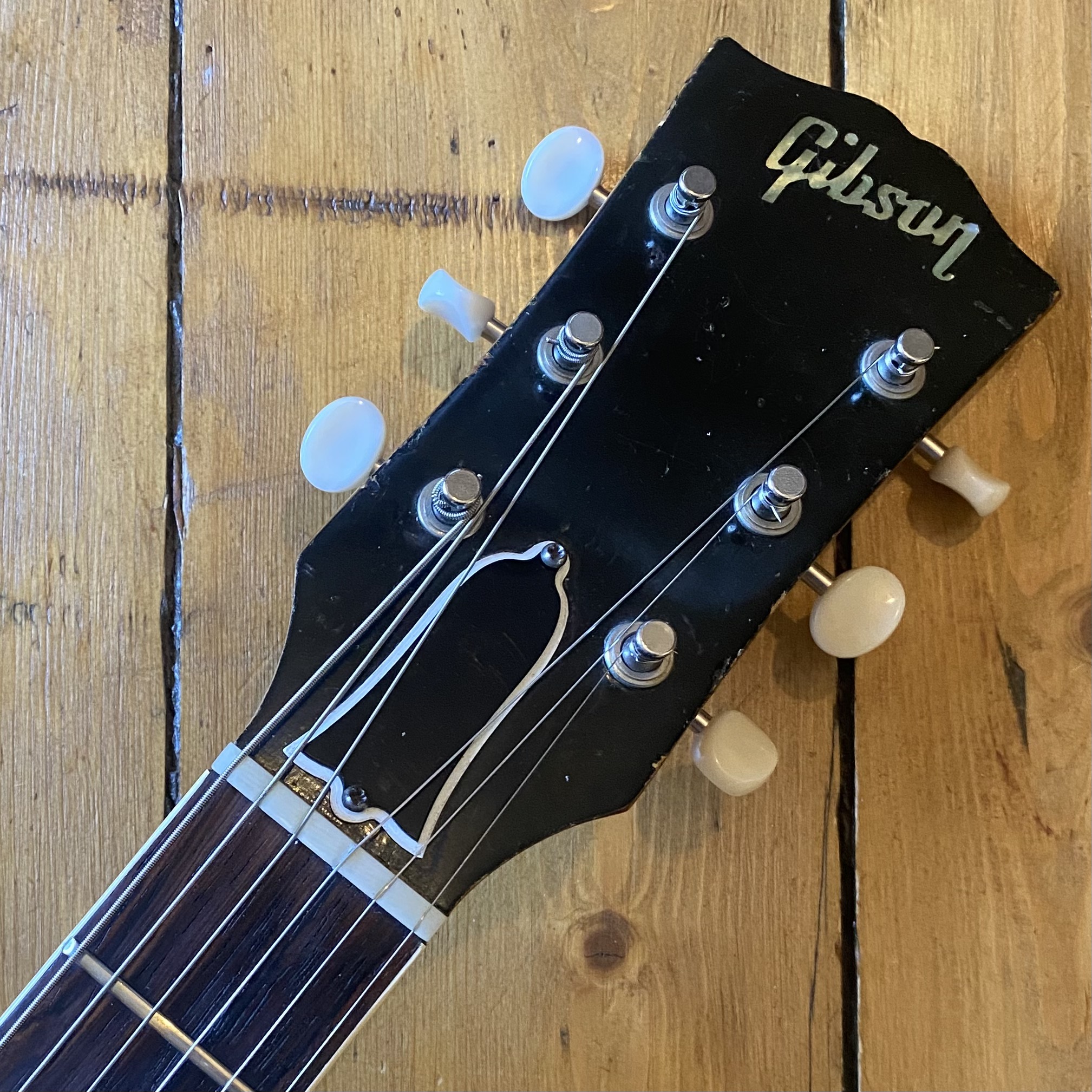 The guitar is original throughout aside from: Refret, jack wiring replaced, 1 capacitor replaced, Period correct Kluson tuners replaced as well as control knob replacement. The control knobs appear to be genuine period correct material Gibson Historic parts as the knobs black light correctly. The bridge is a MojoAxe aged replacement sourced directly from the USA by us. If you are going to play one of these guitars the MojoAxe tailpiece is a must. The guitar has much better intonation, string heights and holds tune with no issues and looks just like the original. The original tailpiece is in the case and fully functioning should you need it.
