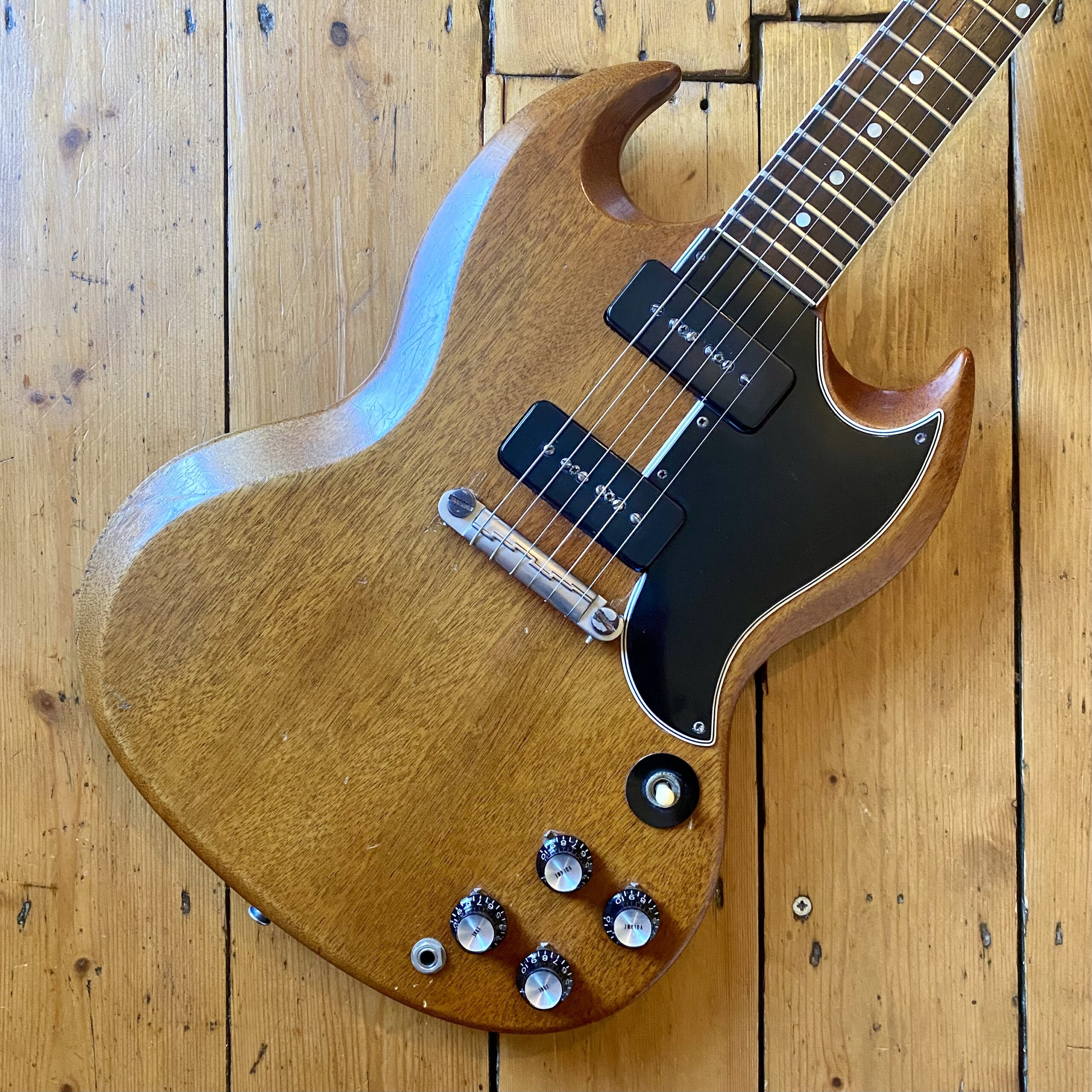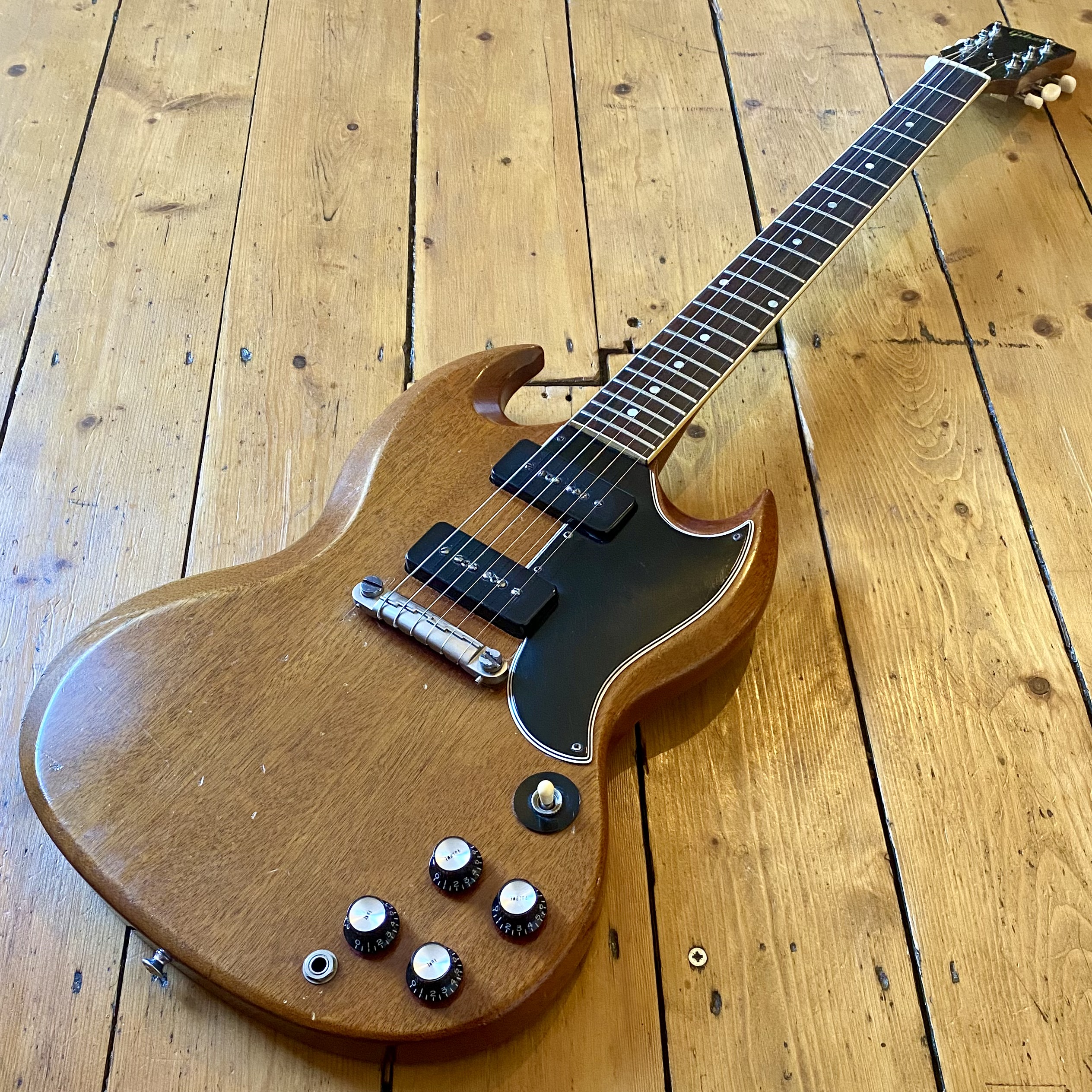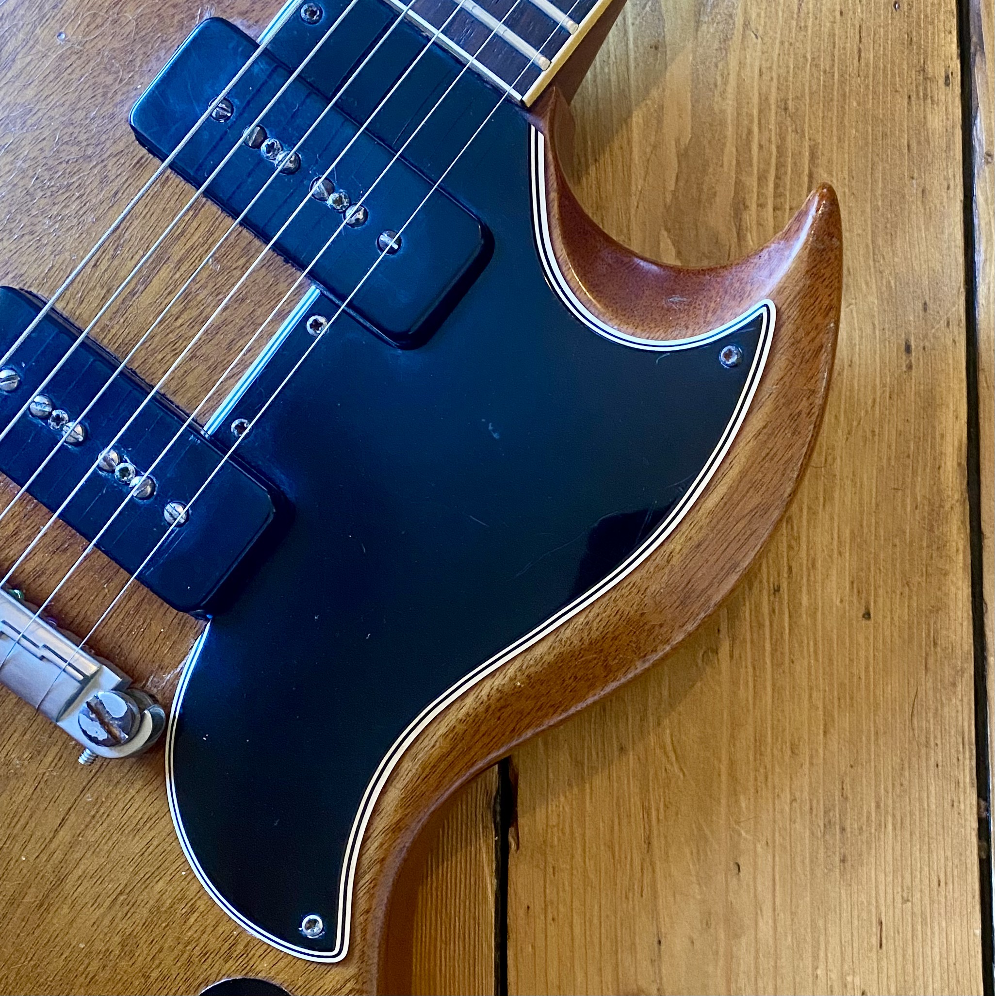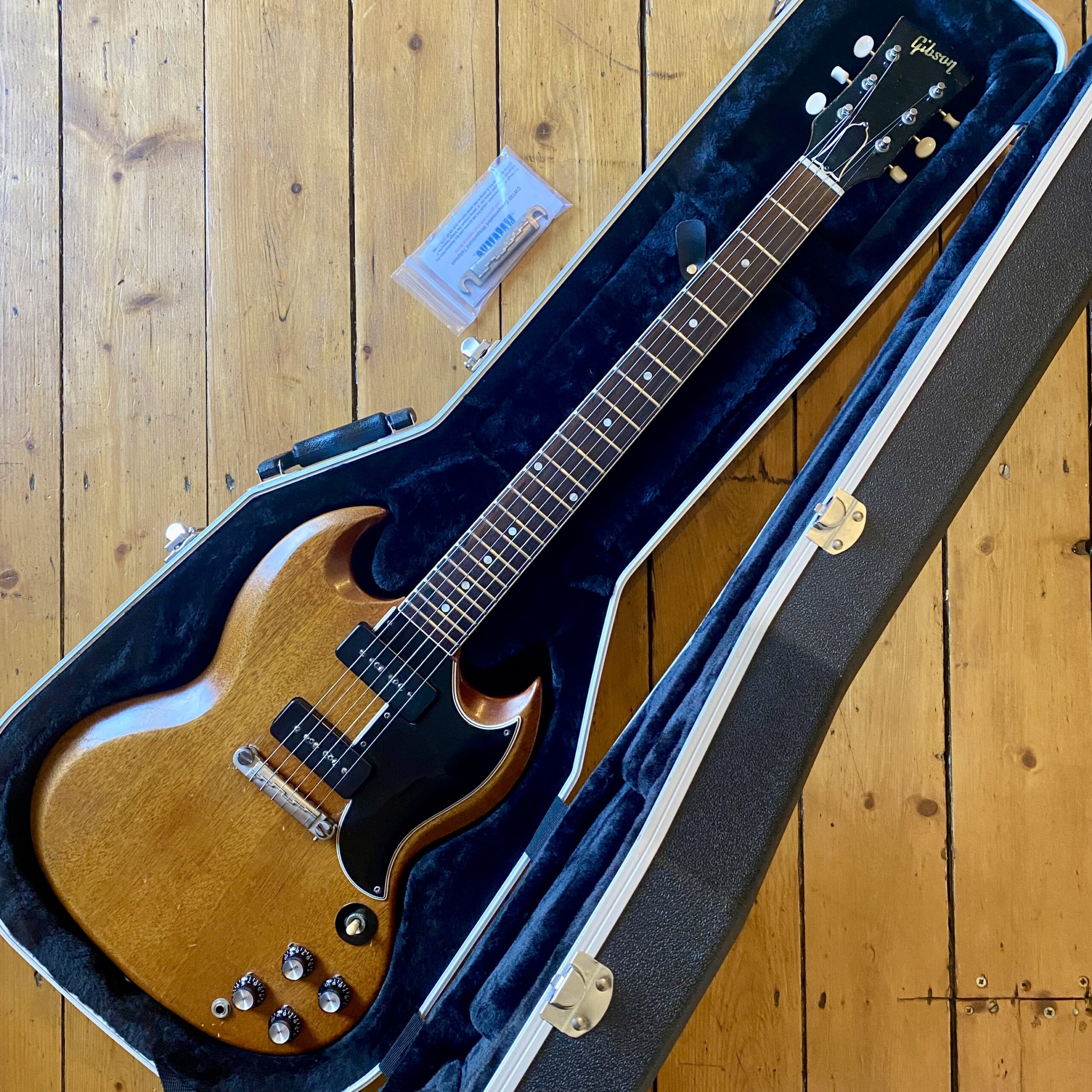 The guitar has aged beautifully with the neck binding worn in nicely along with a beautifully dark, tight grain Brazilian Rosewood fretboard. This SG is a really slinky player, very resonant and easy to get along with. Tone wise it can really sing. Fitted with pair of punchy P90s from Gibsons golden era it really can do it all from smooth cleans all the way to gnarly grit. A non-original Gator hardcase protects your investment.