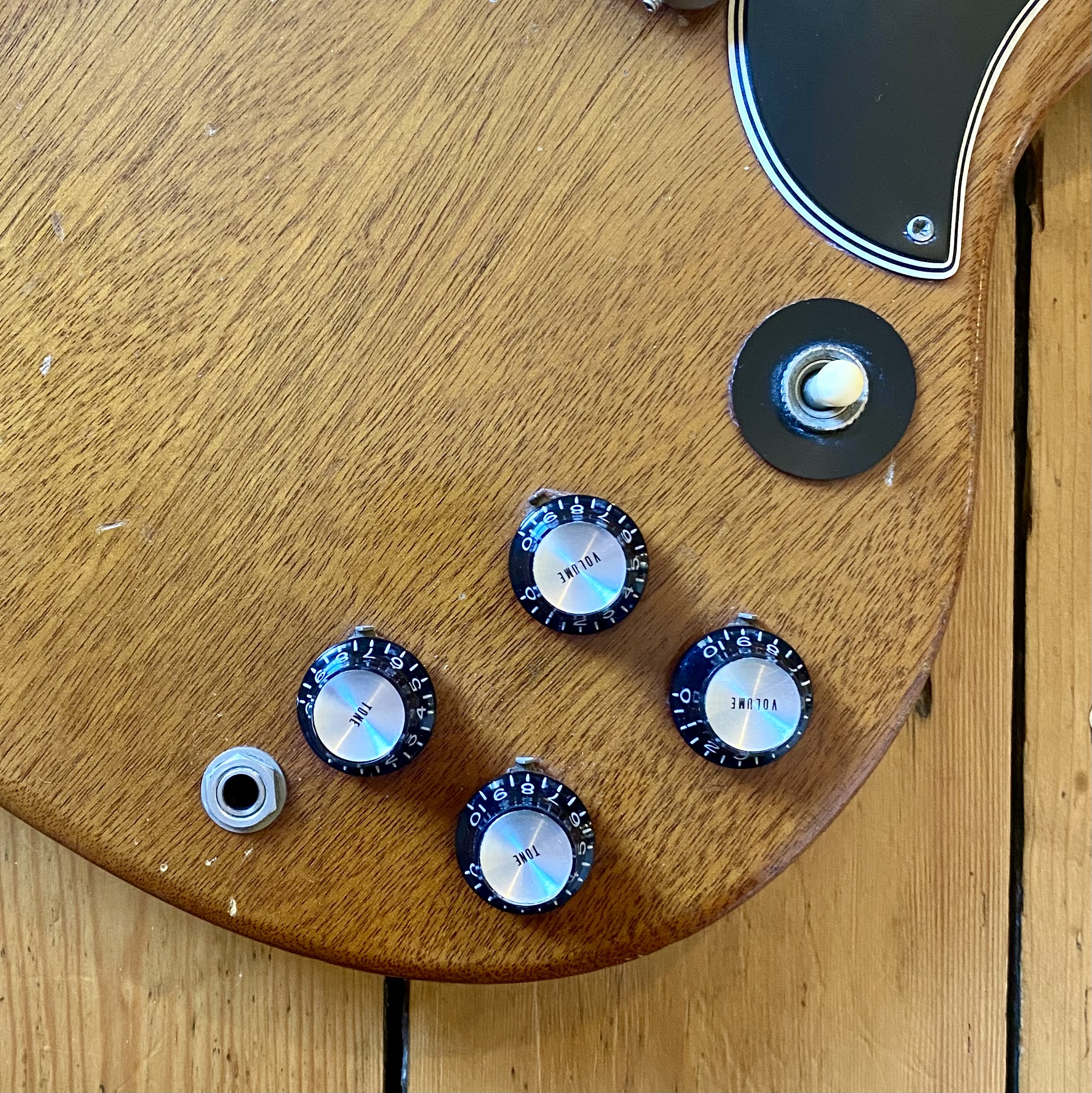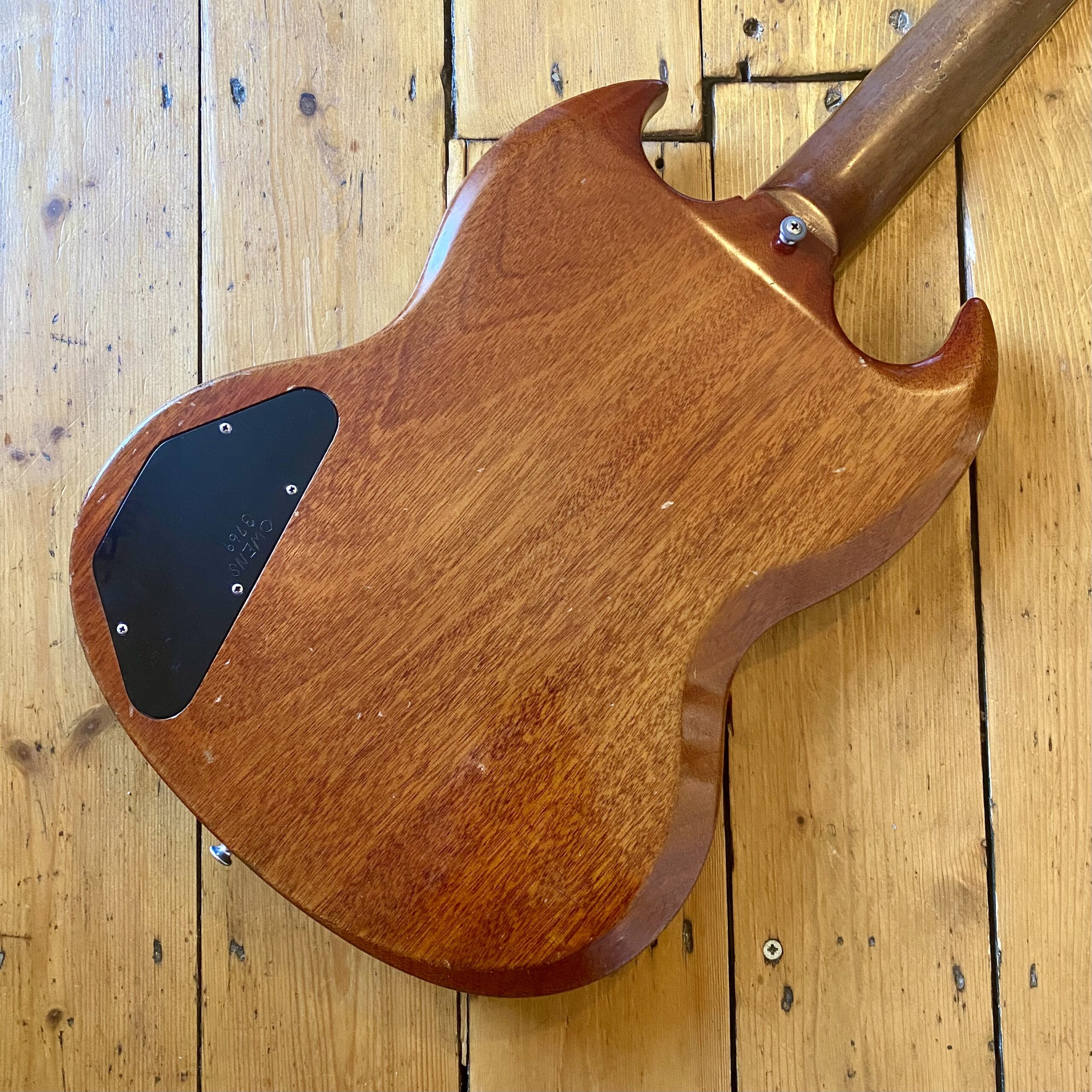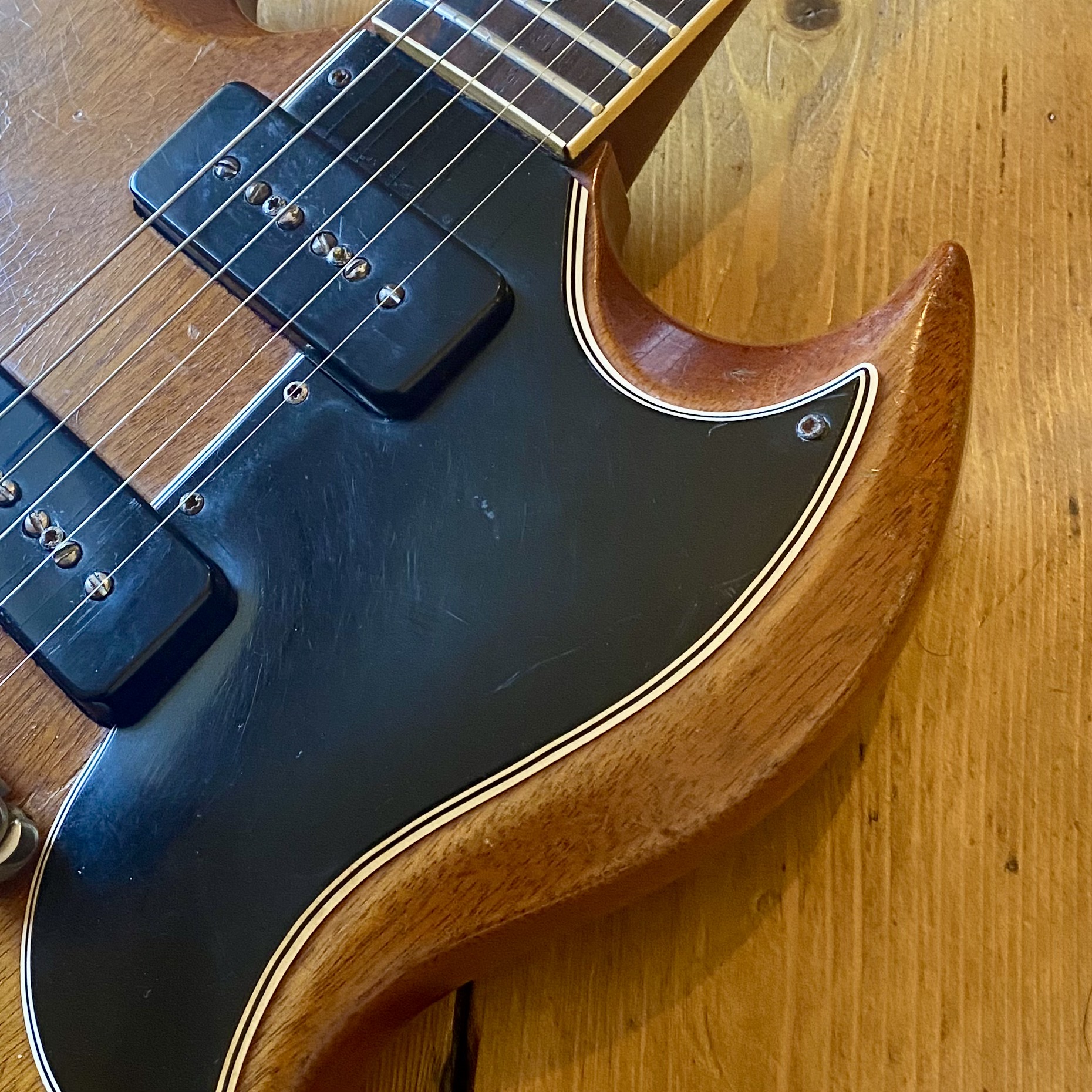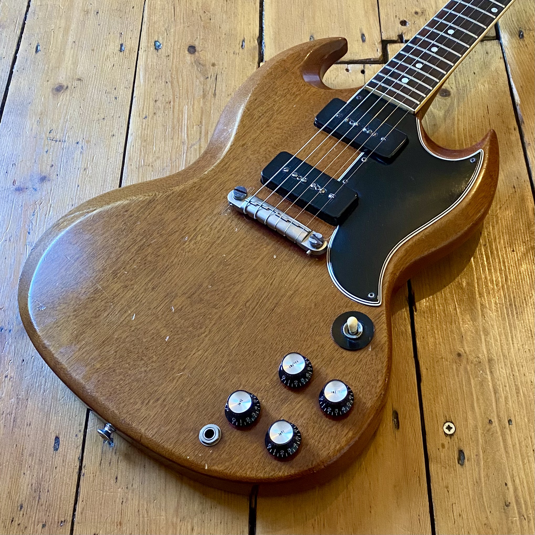 The guitar has aged beautifully with the neck binding worn in nicely along with a beautifully dark, tight grain Brazilian Rosewood fretboard. This SG is a really slinky player, very resonant and easy to get along with. Tone wise it can really sing. Fitted with pair of punchy P90s from Gibsons golden era it really can do it all from smooth cleans all the way to gnarly grit. A non-original Gator hardcase protects your investment.