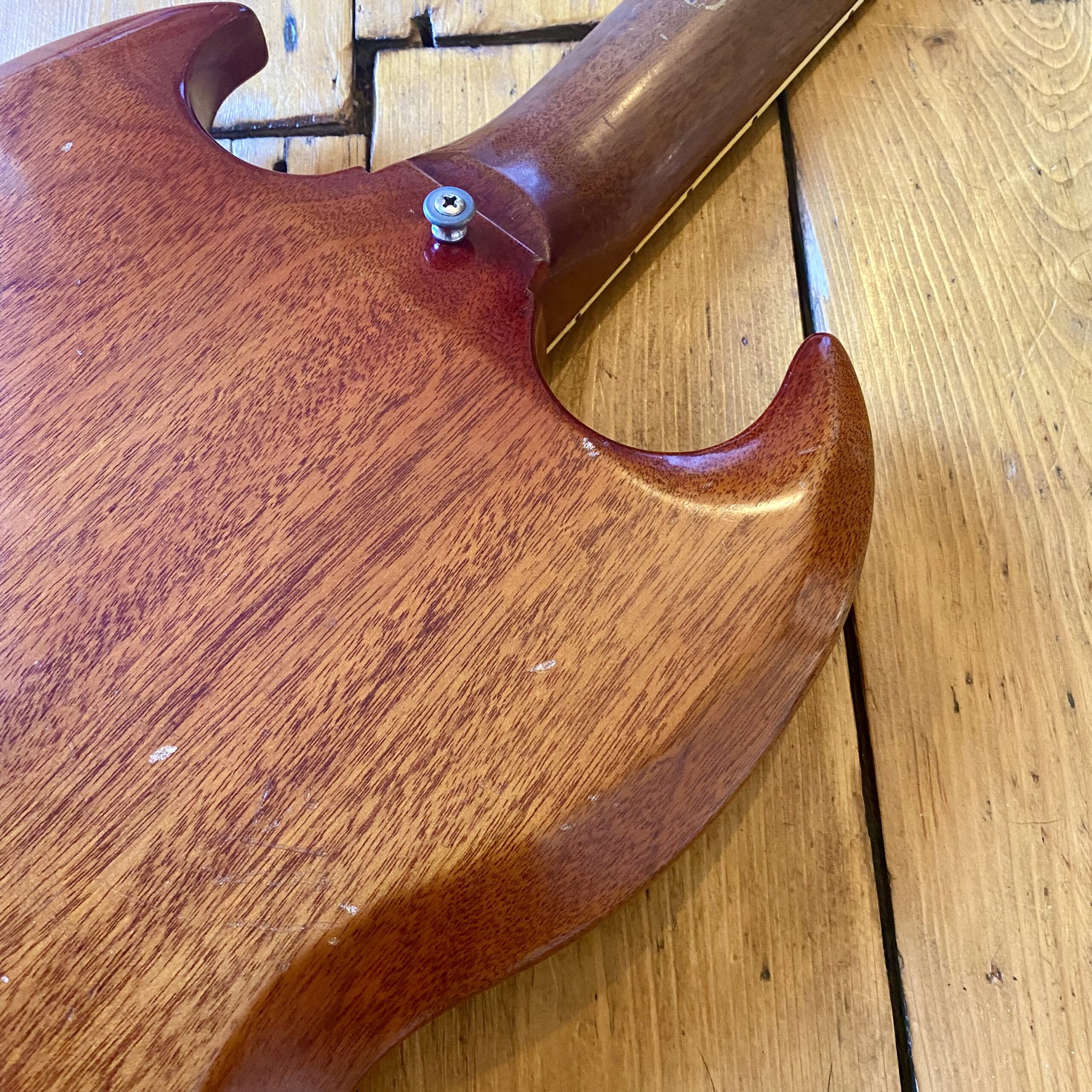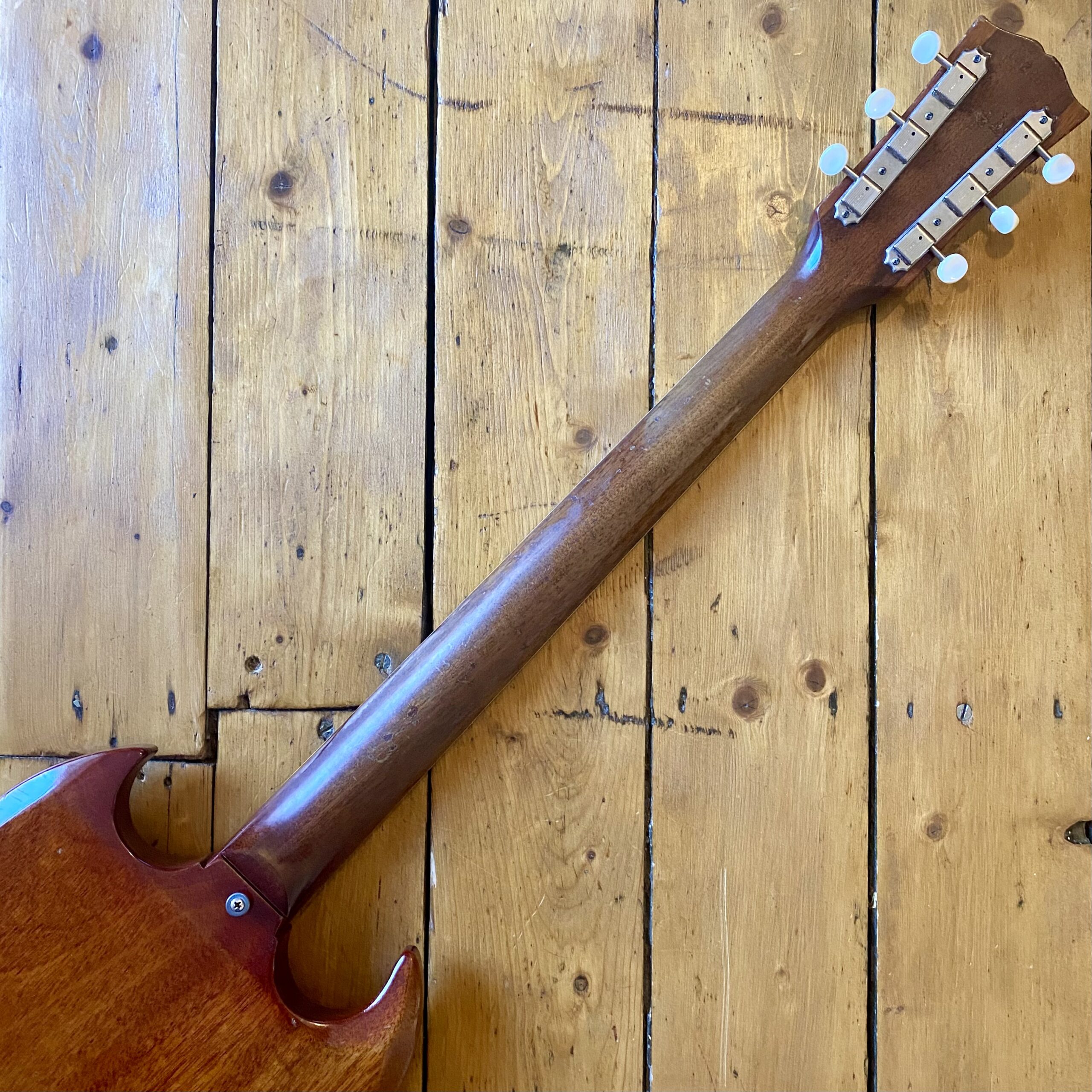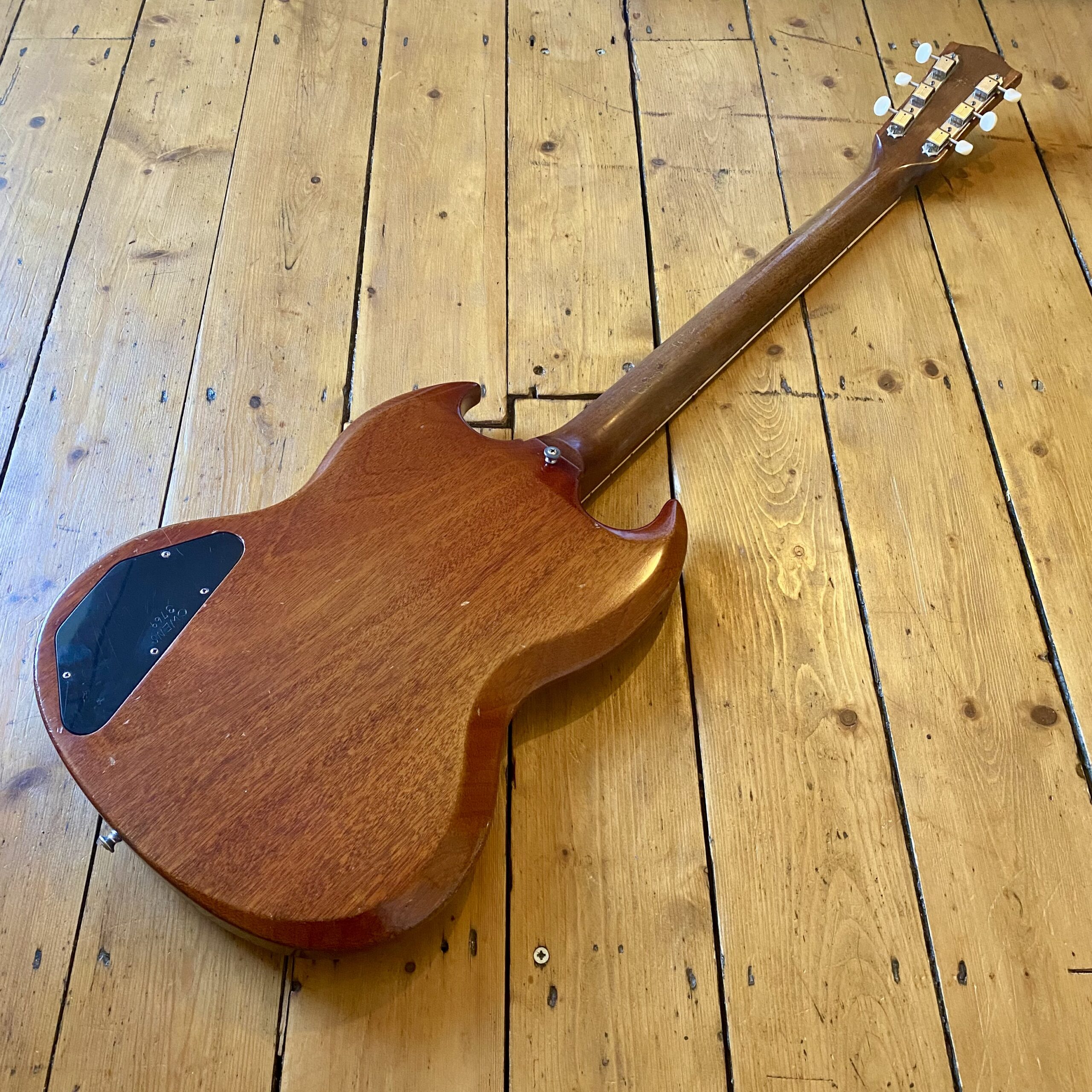 Weighing in at 6.25lbs this is a killer playing and sounding example of the classic workhorse SG Special. The guitar has the sought after 63 neck profile with the body featuring a beautiful naturally faded cherry finish with plenty of lacquer checking as you’d expect with discolouration to the front and back of the body and neck. There are a few dings here and there as you’d expect with any used vintage guitar but nothing significant to worry about. See pictures.
